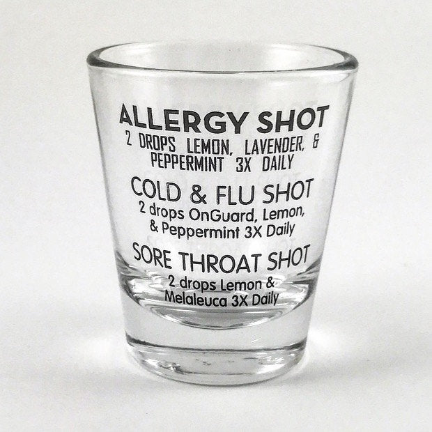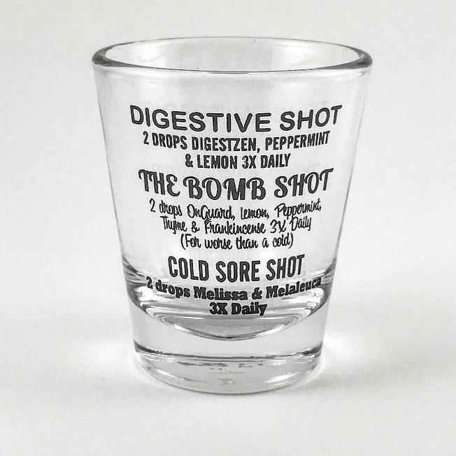 Essential Oils Glassware Gift 1 1/2 oz Recipes Shot Glass – Allergy Cold Flue Sore Throat Digestive Cold Sore - dōTERRA Young Living Helpful Funny Educational Slogans. Glass by Hidden Essentials. Retailer of handmade Essential Oils cabinet boxes. Product made in the United States. Thick Tapered Glass. Excellent Quality.