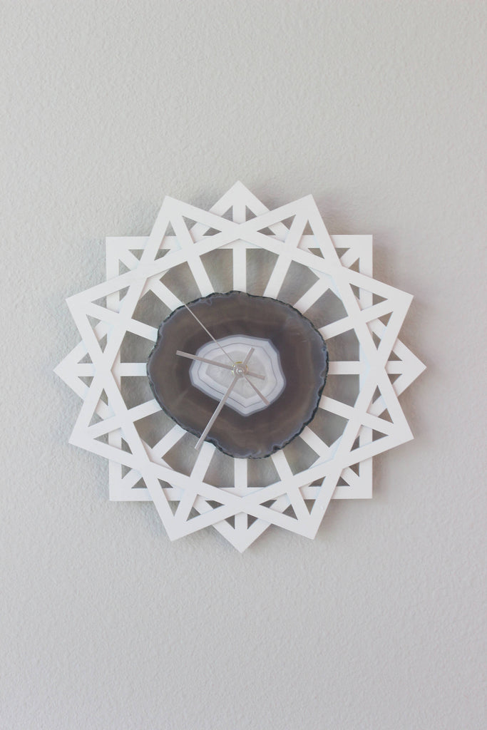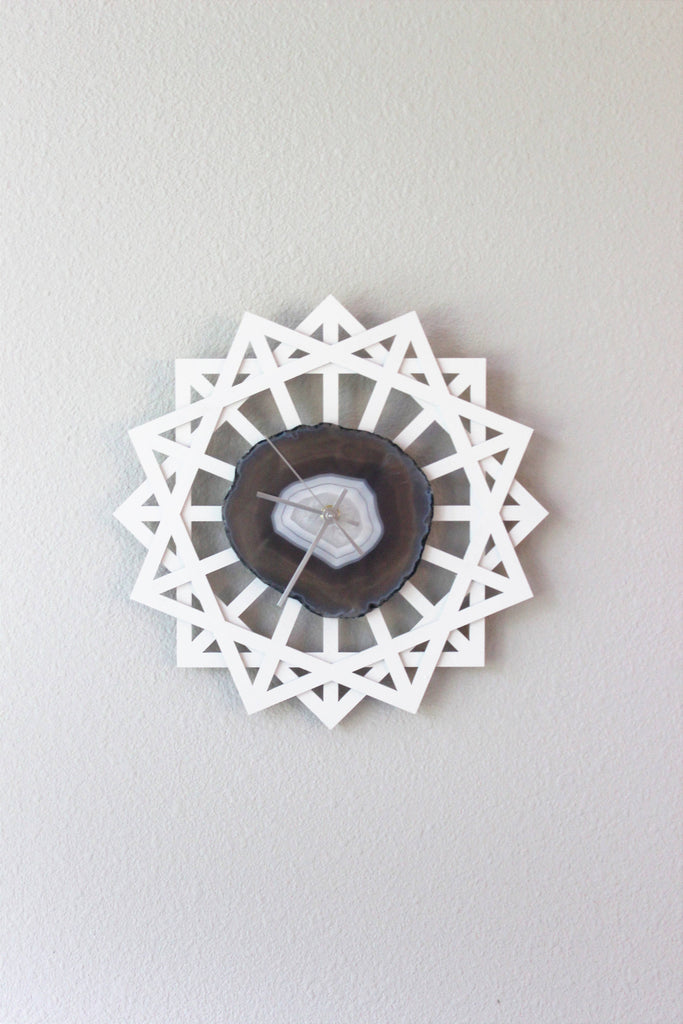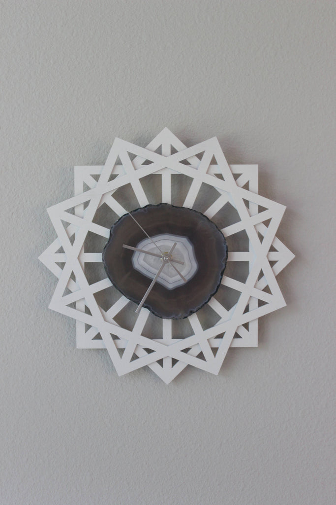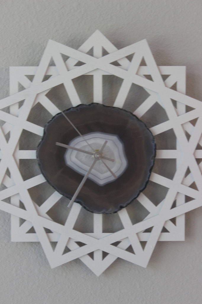 Materials: agate,wood,quartz,birch wood,matte white painted wood,natural geode,natural agate,gray agate,gray agate slice,white clock,natural agate slice,silver hands,FREE SHIPPING