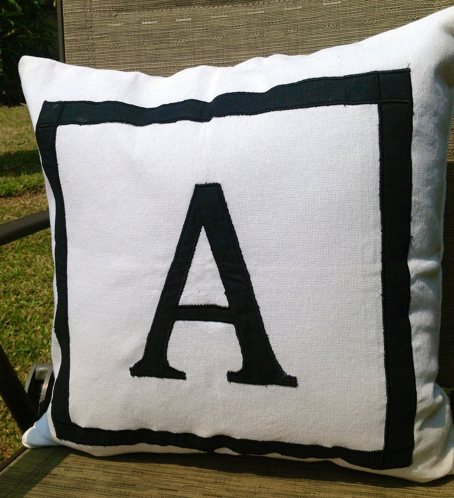 Personalized 30x30 monogrammed white euro shams are very elegant and ideal to add personality to your living room or bedroom. Customized in any letter and the trim color around it, this throw pillow cover is made with 100% cotton hand weaved material and appliqued with black linen or cotton.