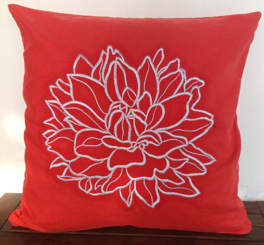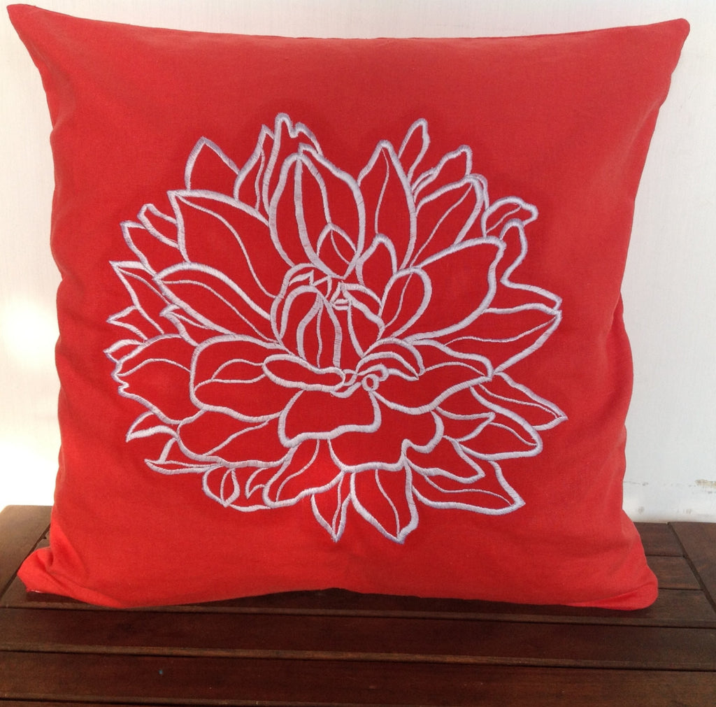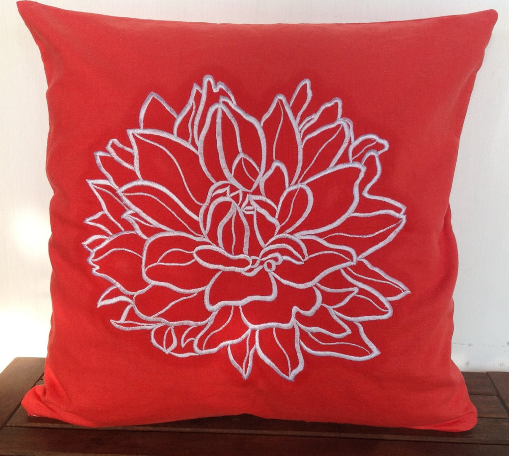 Modern and adorable Orange throw pillow cover is embroidered with white beautiful flower.