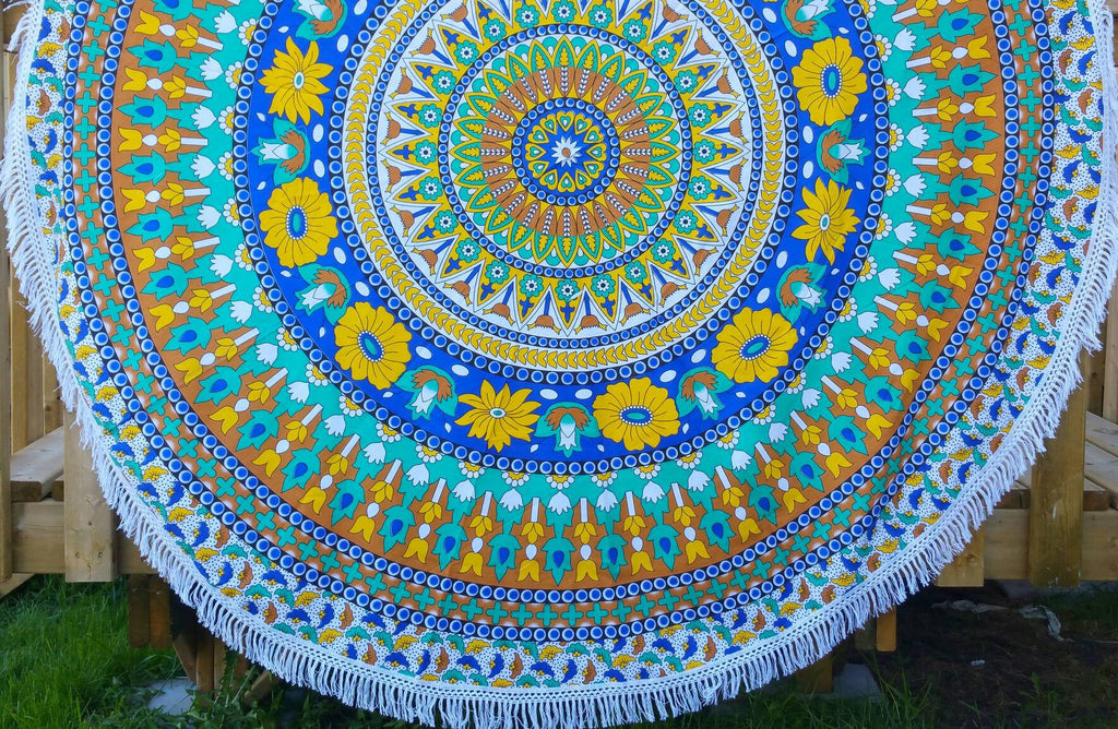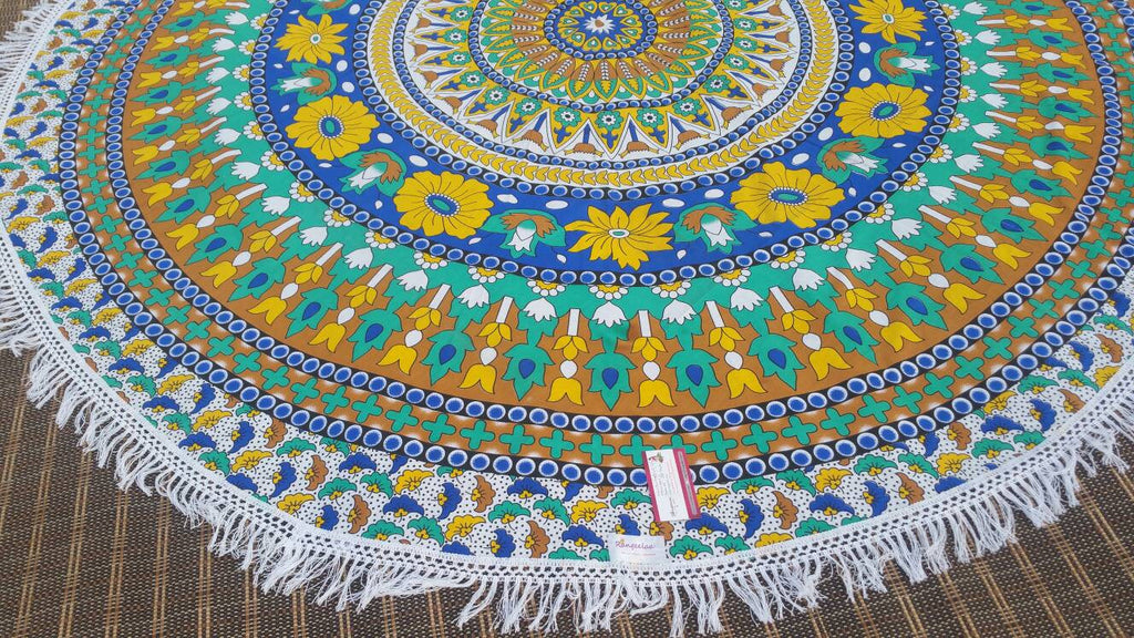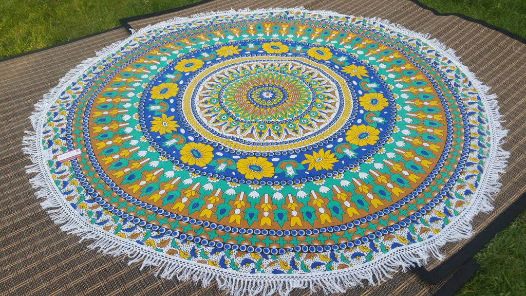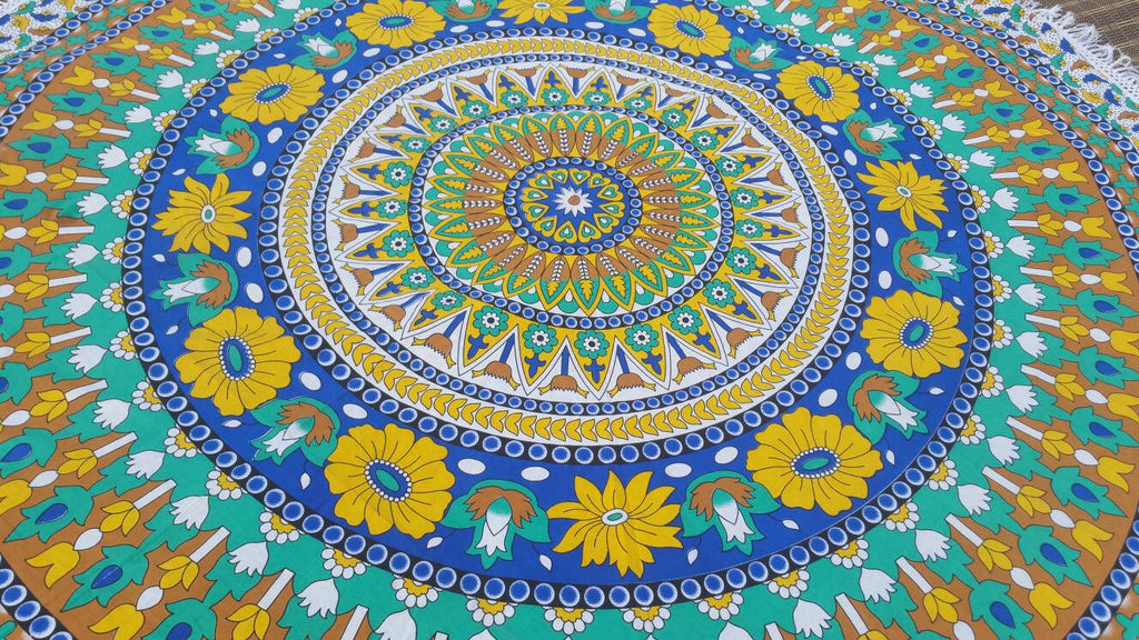 These astonishing Floral Cut Roundies are passionately created by women in India. Made of Cotton, these Roundies are a colorful feast to see and have around. They come in stunning prints and vibrant color combinations. They serve versatile purposes. Use it as a Yoga Mat, Dining table cover, Meditation Mat, Couch Throw, Wall Tapestry or a Beach Throw. These Roundies are made with a thin Cotton fabric which is easy to wash. Either Pompoms or Tassels which are carefully stitched along the border add nice classic touch to these throws.