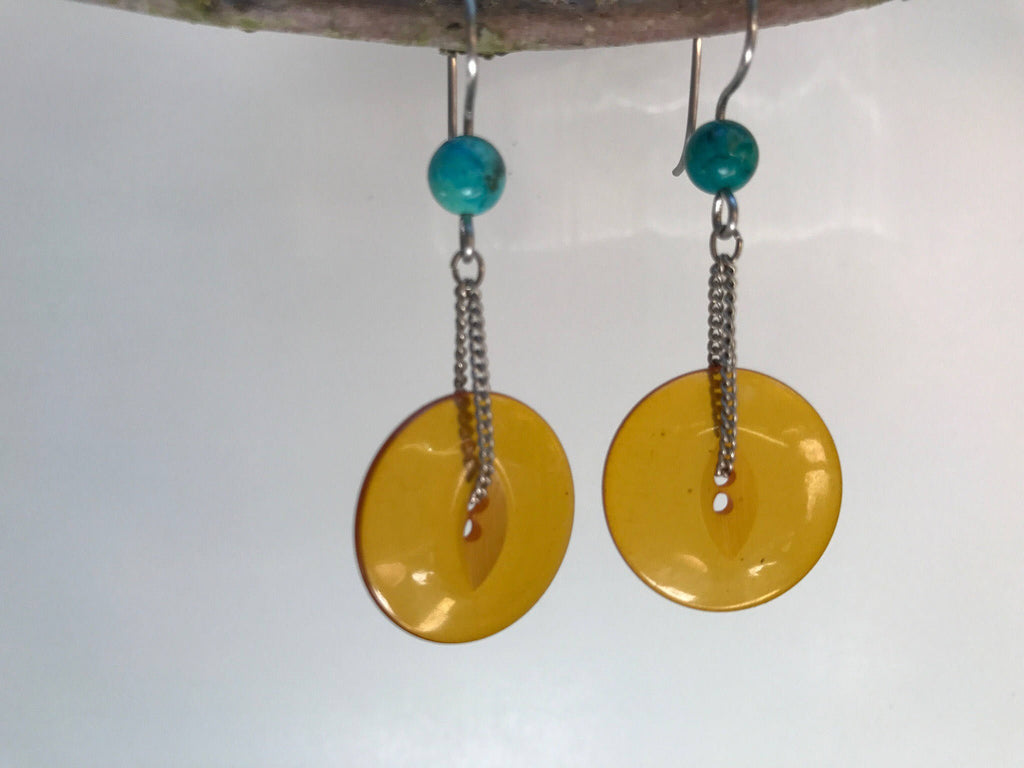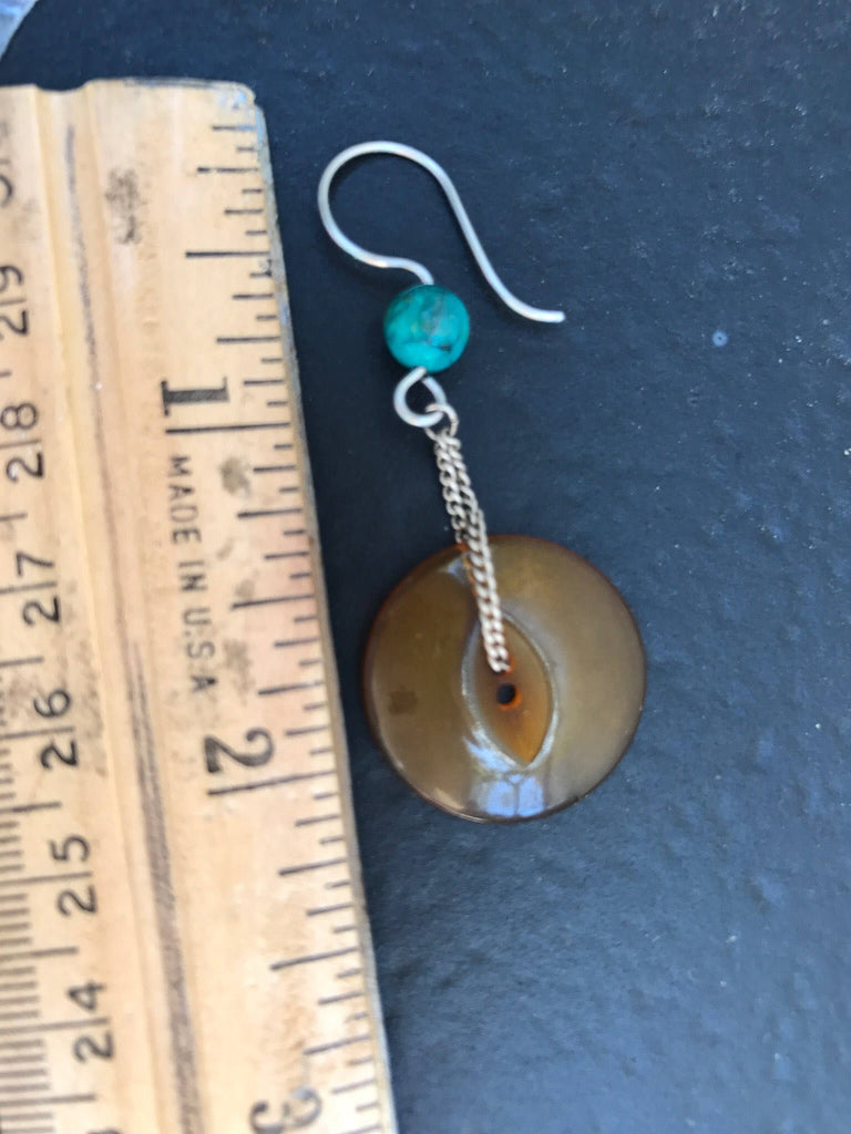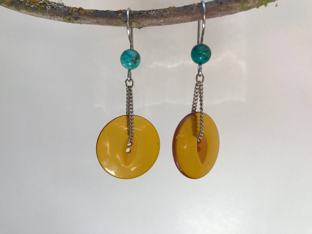 Amber Bakelite Button Earrings, Vintage Buttons, Turquoise Beads, Silver Chain, Hand Made French Hook Ear Wires, Dangle Drop Earring