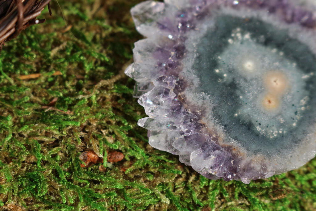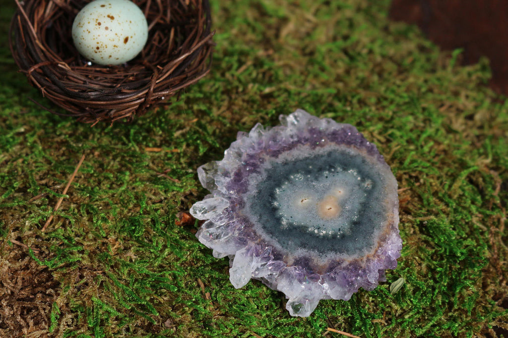 With shades of violet, a perfect little Amethyst Stalactite slice from Uruguay. Highly polished on both sides, rich with color and tiny pockets of rainbows. An absolutely perfect piece to wire wrap as a pendant and beautiful enough to display on its own or on a mini stand or easel.