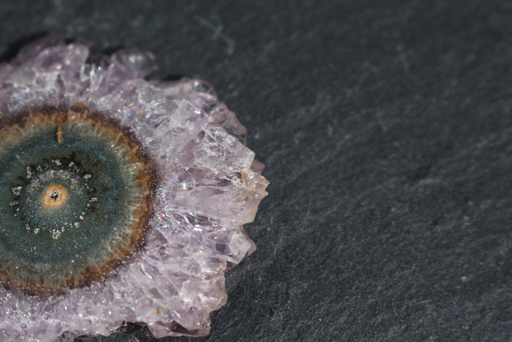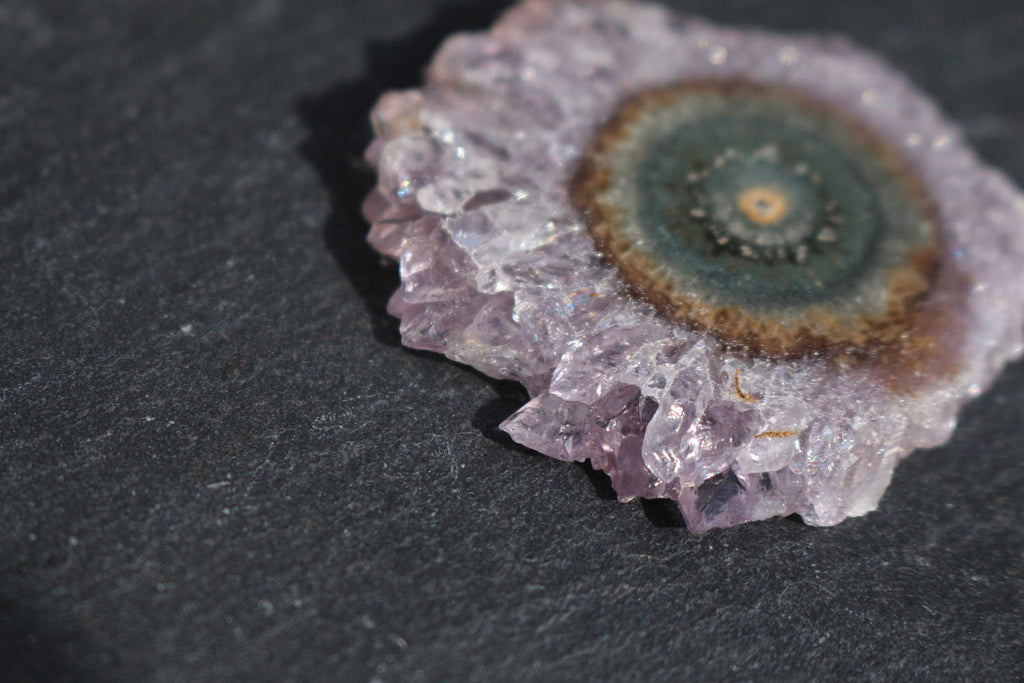 With shades of violet, a perfect little Amethyst Stalactite slice from Uruguay. Highly polished on both sides, rich with color and tiny pockets of rainbows. An absolutely perfect piece to wire wrap as a pendant and beautiful enough to display on its own or on a mini stand or easel.