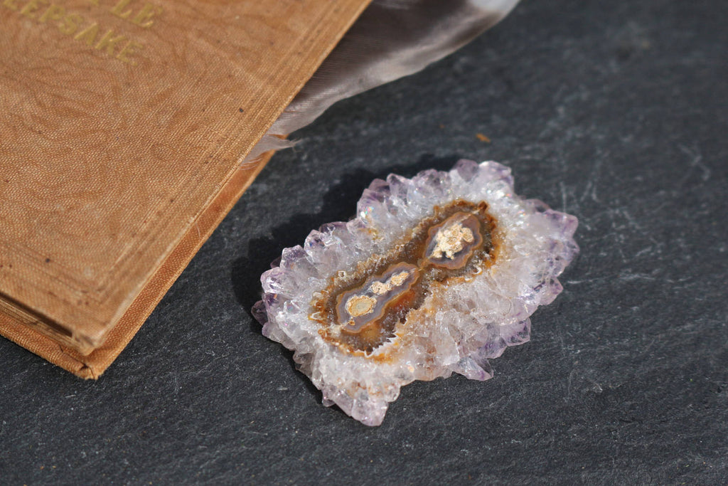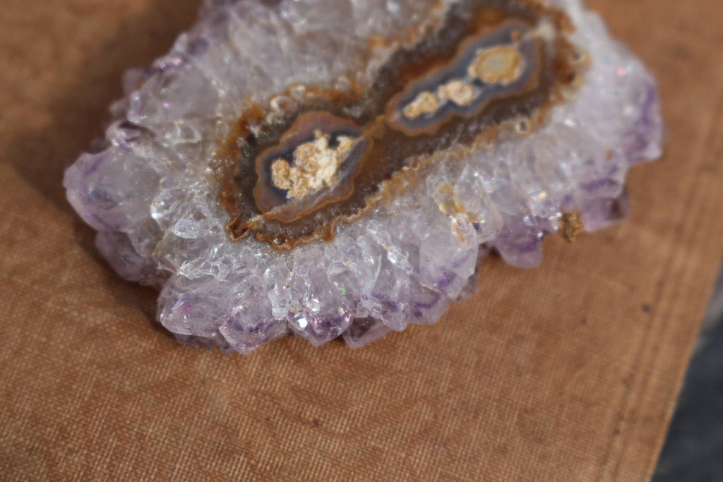 With shades of violet, a perfect little Amethyst Stalactite slice from Uruguay. Highly polished on both sides, rich with color and tiny pockets of rainbows. An absolutely perfect piece to wire wrap as a pendant and beautiful enough to display on its own or on a mini stand or easel.