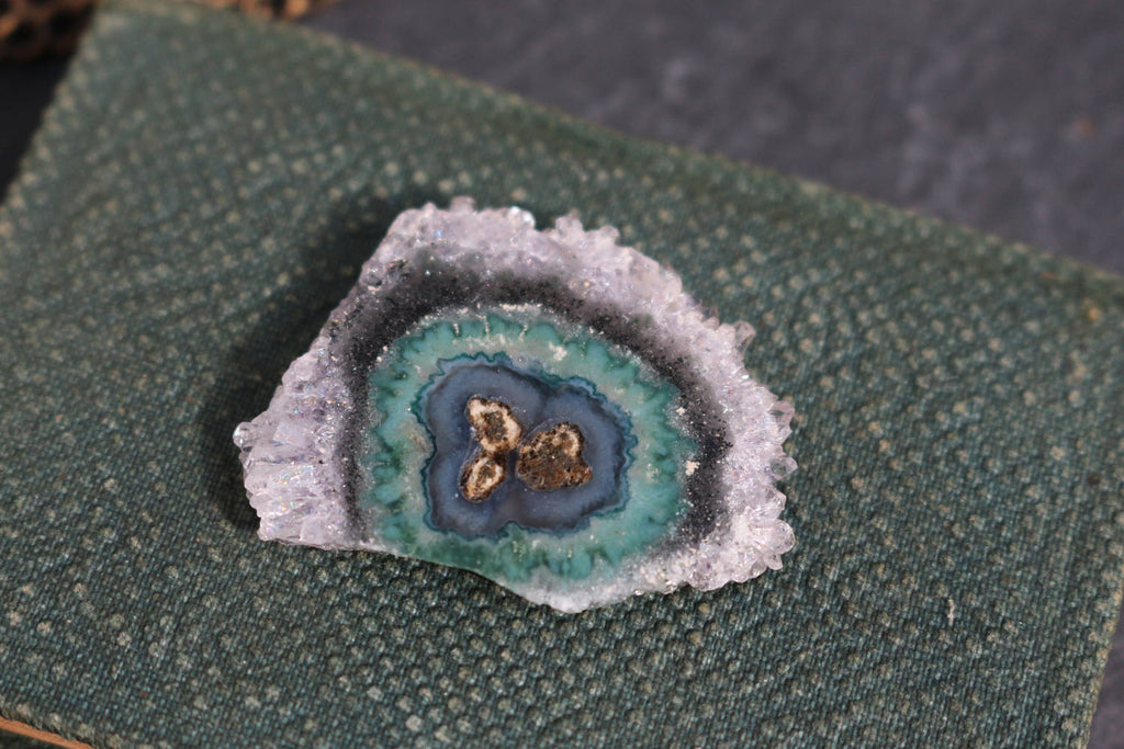 With shades of violet, a perfect little Amethyst Stalactite slice from Uruguay. Highly polished on both sides, rich with color and tiny pockets of rainbows. An absolutely perfect piece to wire wrap as a pendant and beautiful enough to display on its own or on a mini stand or easel. This listing is for one (1) Stalactite and being that they are all almost identical, please let us select one for you.