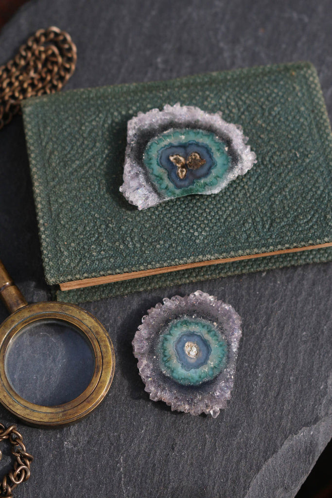 Stalactites are found around the World and naturally form in caves. As each drop of mineral rich water falls, it leaves behind a small ring~ and with every subsequent drop, slowly this once single ring deposit forms into lengths of mineral rich crystal geodes which are then cut in to slices to view its beauty... somewhat similar to the rings of an aged tree.