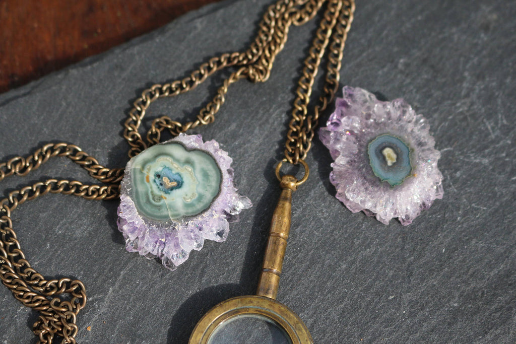 With shades of violet, a perfect little Amethyst Stalactite slice from Uruguay. Highly polished on both sides, rich with color and tiny pockets of rainbows. An absolutely perfect piece to wire wrap as a pendant and beautiful enough to display on its own or on a mini stand or easel. This listing is for one (1) Stalactite and being that they are all almost identical, please let us select one for you.