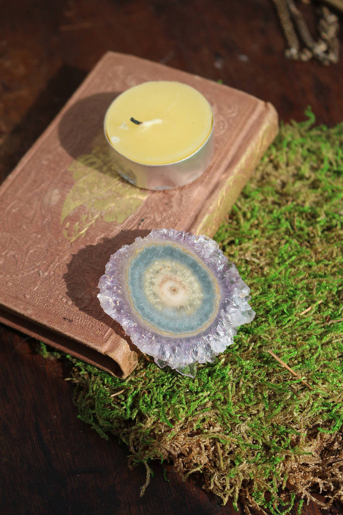 With shades of violet, a perfect little Amethyst Stalactite slice from Uruguay. Highly polished on both sides, rich with color and tiny pockets of rainbows. An absolutely perfect piece to wire wrap as a pendant and beautiful enough to display on its own or on a mini stand or easel.