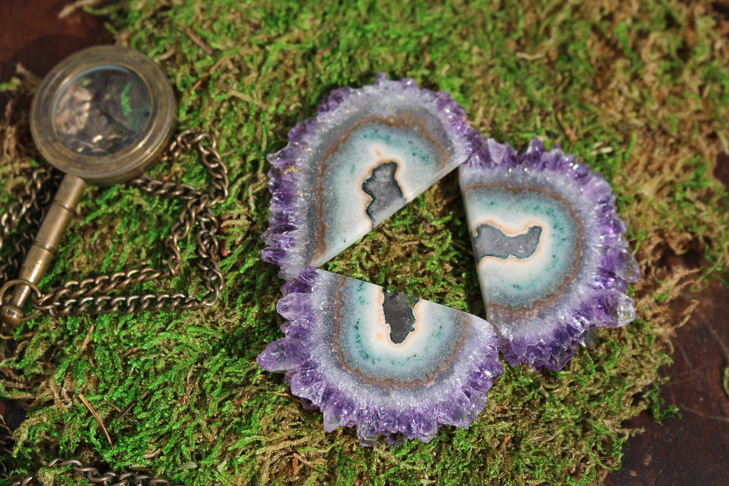 With shades of violet, a perfect little Amethyst Stalactite slice from Uruguay. Highly polished on both sides, rich with color and tiny pockets of rainbows. An absolutely perfect piece to wire wrap as a pendant and beautiful enough to display on its own or on a mini stand or easel. This listing is for one (1) Stalactite and being that they are all almost identical, please let us select one for you.