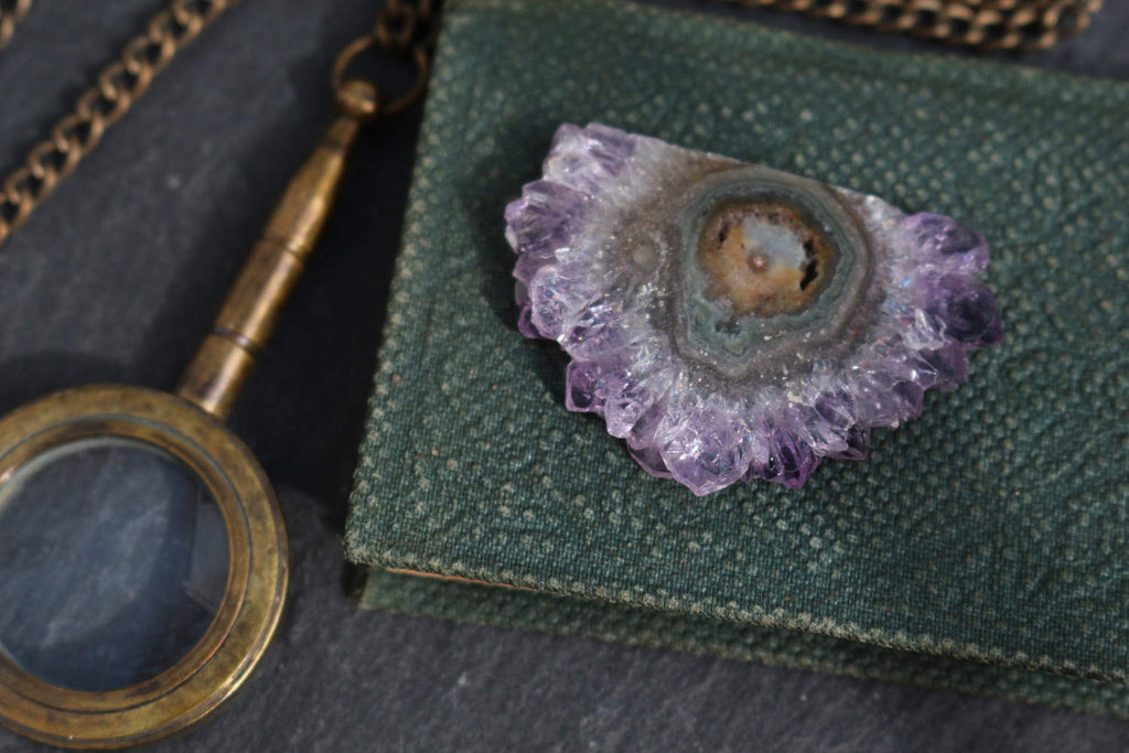 With shades of violet, a perfect little Amethyst Stalactite slice from Uruguay. Highly polished on both sides, rich with color and tiny pockets of rainbows. An absolutely perfect piece to wire wrap as a pendant and beautiful enough to display on its own or on a mini stand or easel.