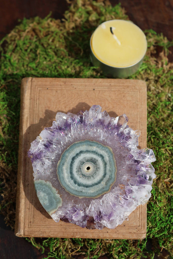 With shades of violet, a perfect little Amethyst Stalactite slice from Uruguay. Highly polished on both sides, rich with color and tiny pockets of rainbows. An absolutely perfect piece to wire wrap as a pendant and beautiful enough to display on its own or on a mini stand or easel.