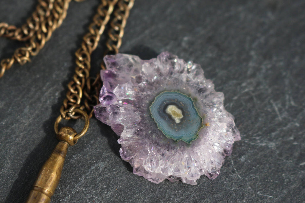 With shades of violet, a perfect little Amethyst Stalactite slice from Uruguay. Highly polished on both sides, rich with color and tiny pockets of rainbows. An absolutely perfect piece to wire wrap as a pendant and beautiful enough to display on its own or on a mini stand or easel. This listing is for one (1) Stalactite and being that they are all almost identical, please let us select one for you.