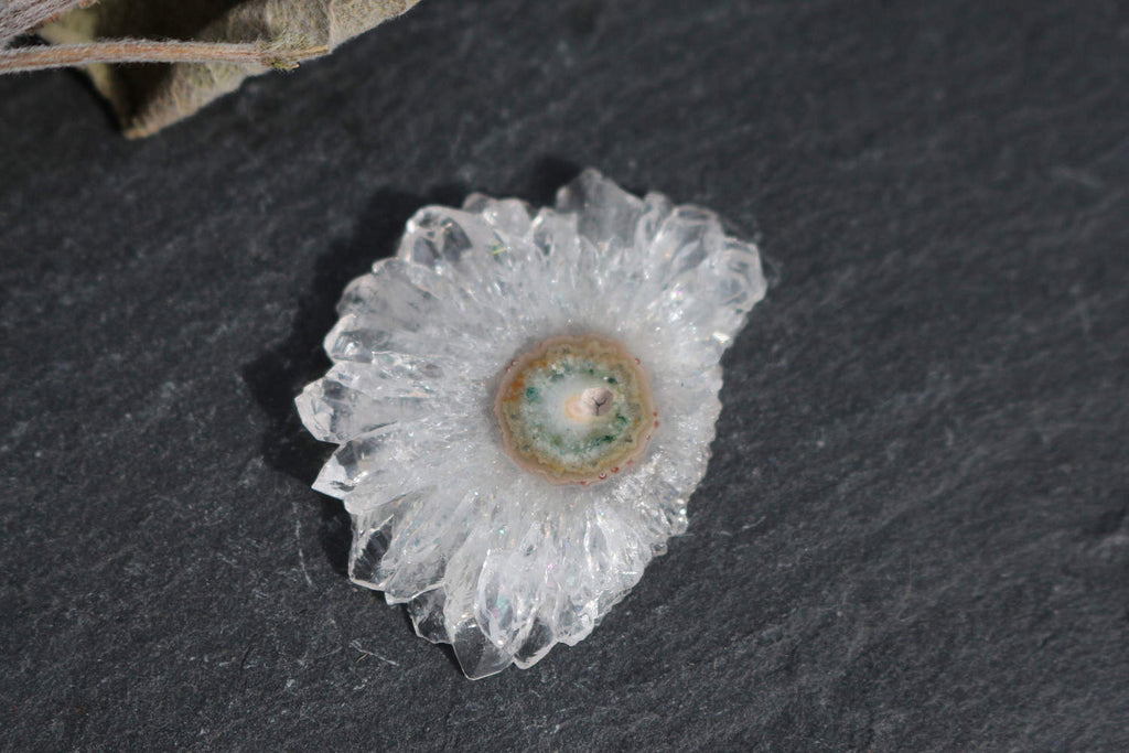 Stalactites are found around the World and naturally form in caves. As each drop of mineral rich water falls, it leaves behind a small ring~ and with every subsequent drop, slowly this once single ring deposit forms into lengths of mineral rich crystal geodes which are then cut in to slices to view its beauty... somewhat similar to the rings of an aged tree.