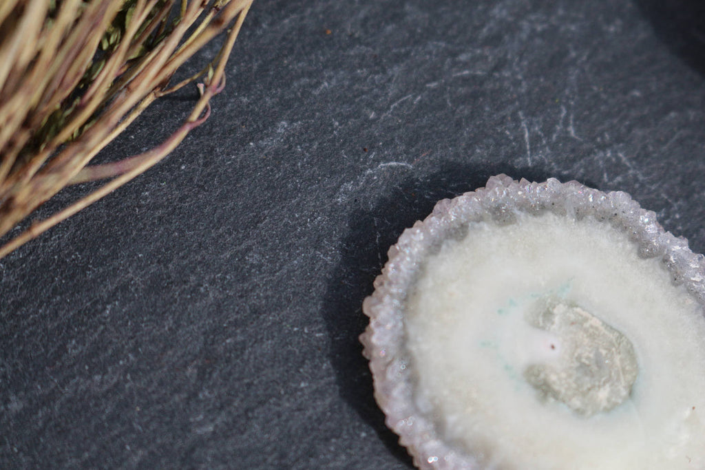 Stalactites are found around the World and naturally form in caves. As each drop of mineral rich water falls, it leaves behind a small ring~ and with every subsequent drop, slowly this once single ring deposit forms into lengths of mineral rich crystal geodes which are then cut in to slices to view its beauty... somewhat similar to the rings of an aged tree.