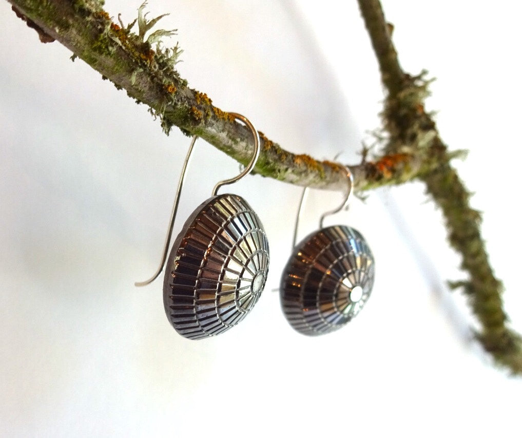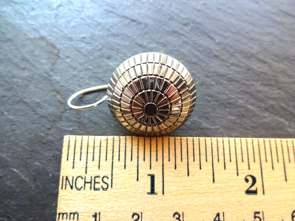 This is a pair of antique black glass button earrings with bright silver luster. The buttons are domed and faceted and the look is glittery. They're old but have a very modern vibe. The buttons are 7/8" in diameter and the earrings are 1 3/4" long. I made these with silver filled ear wires.