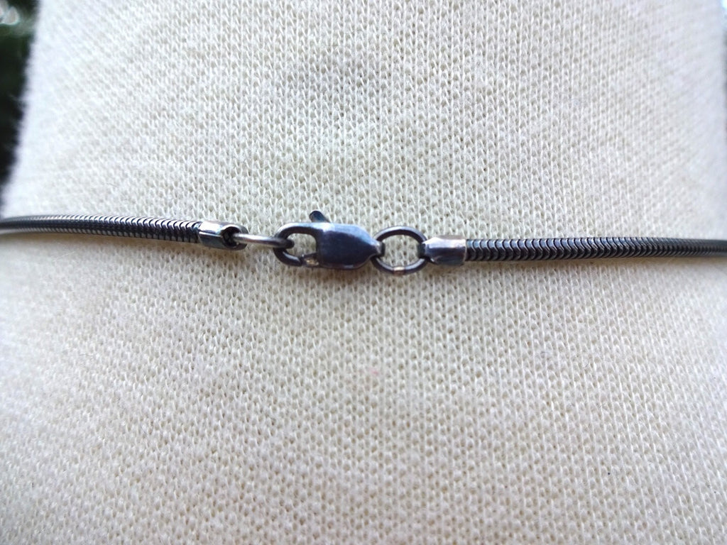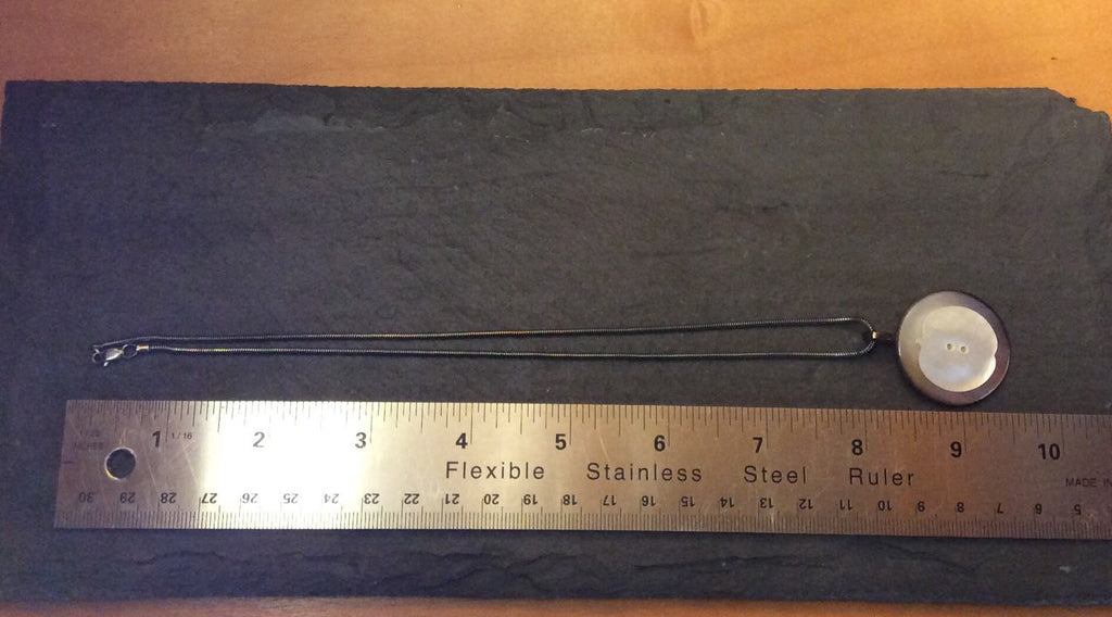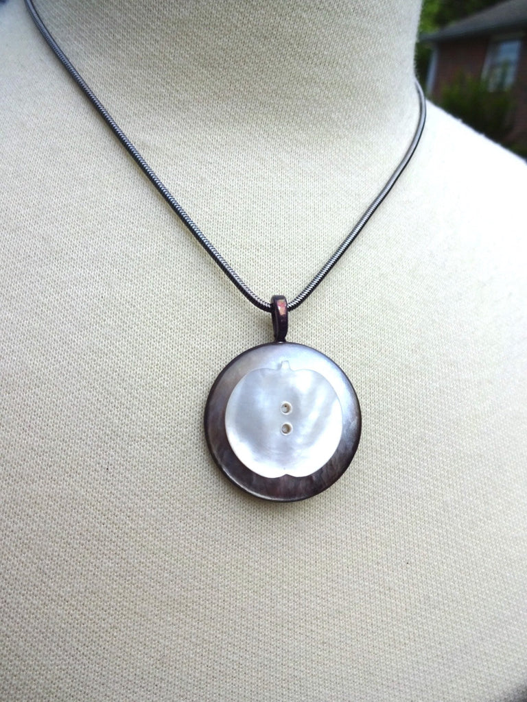 This pendant necklace is a marriage of two vintage mother of pearl buttons. The base is a silver grey button topped with a white mother of pearl button in the shape of an apple. I hung the pendant on a 16" vintage oxidized sterling silver snake chain. The necklace has a clean, uncomplicated look that makes it a perfect gift.