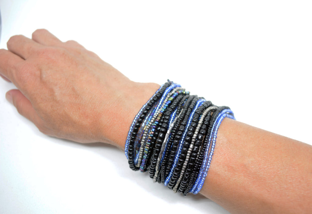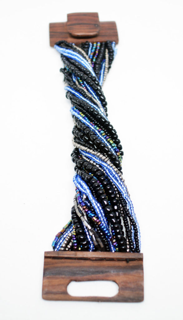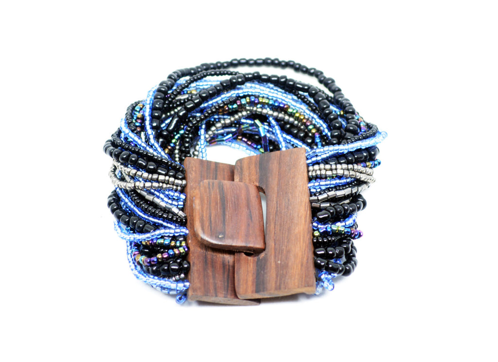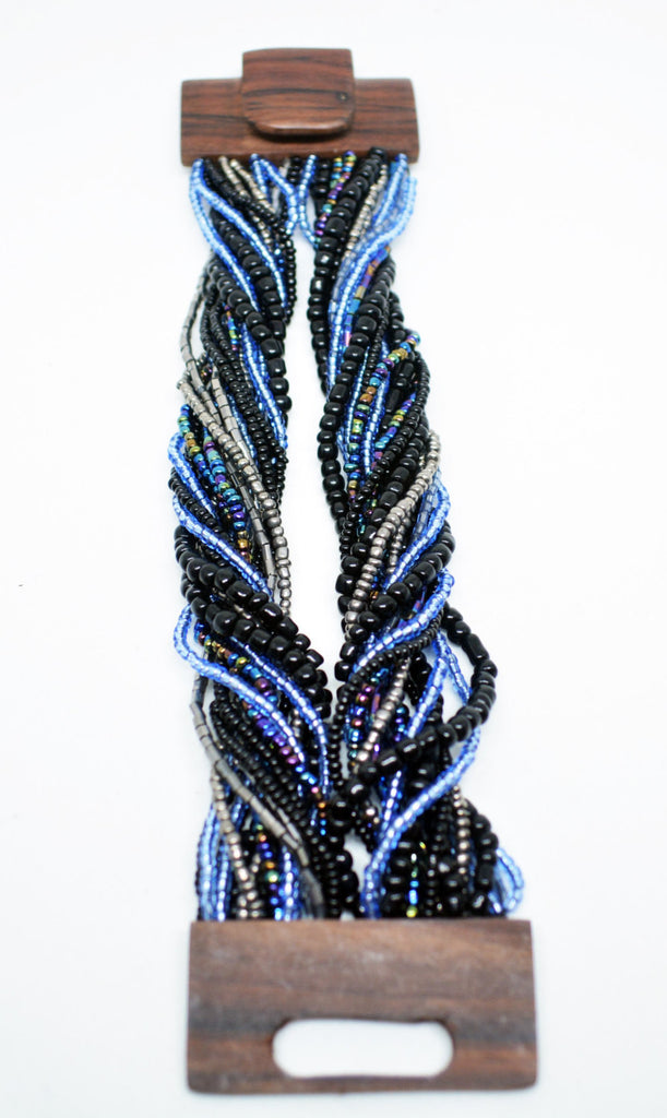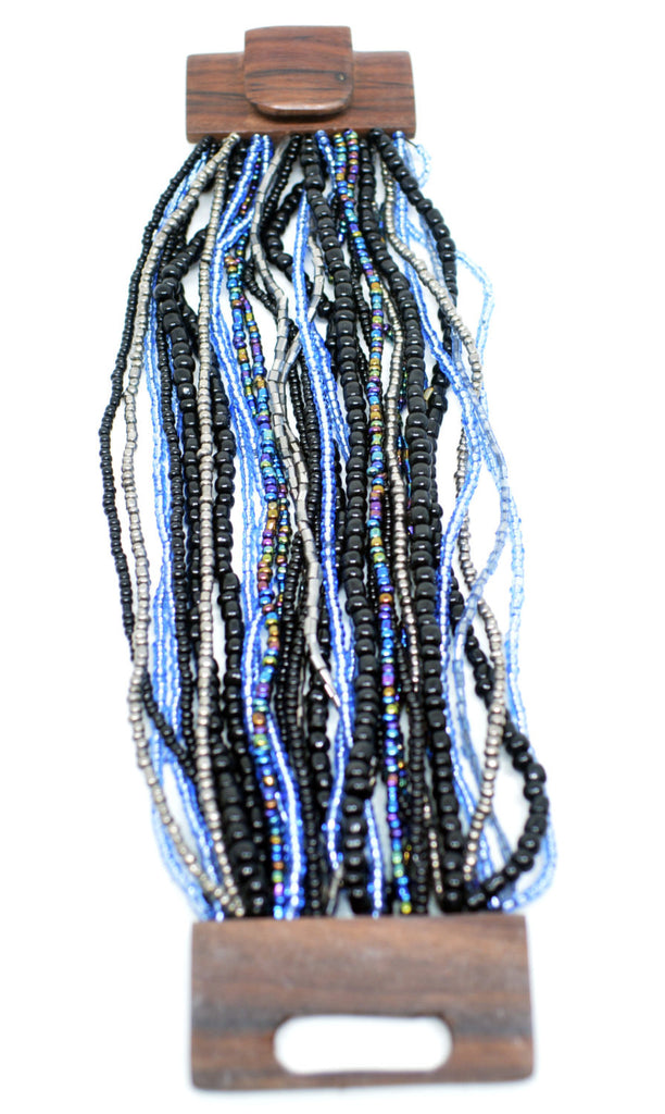 Unique stretchy style beaded bracelet with unique wood clasp at the end. Metallic grey, light blue and black multi strand beaded bracelet, with a square wooden buckle clasp.