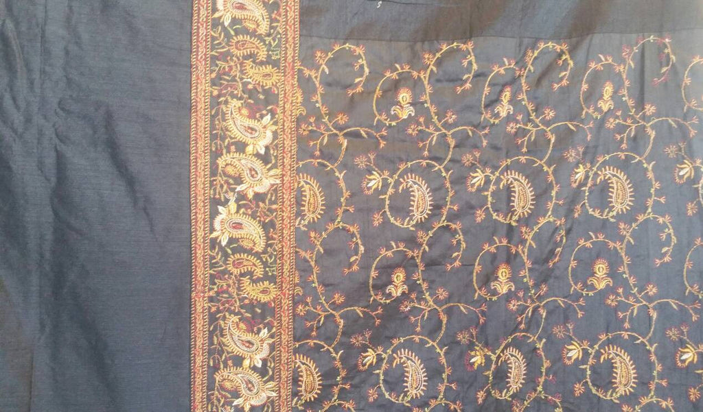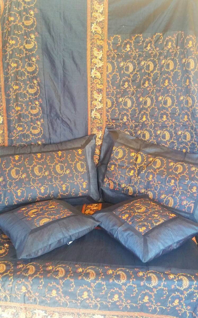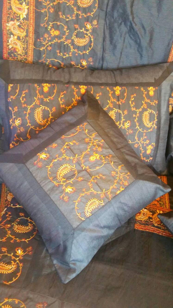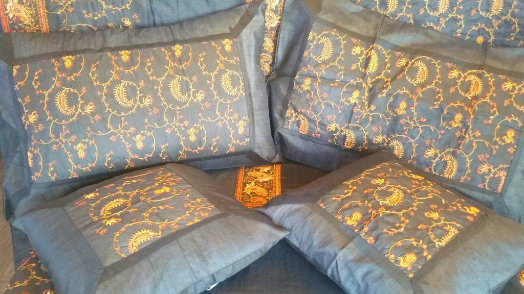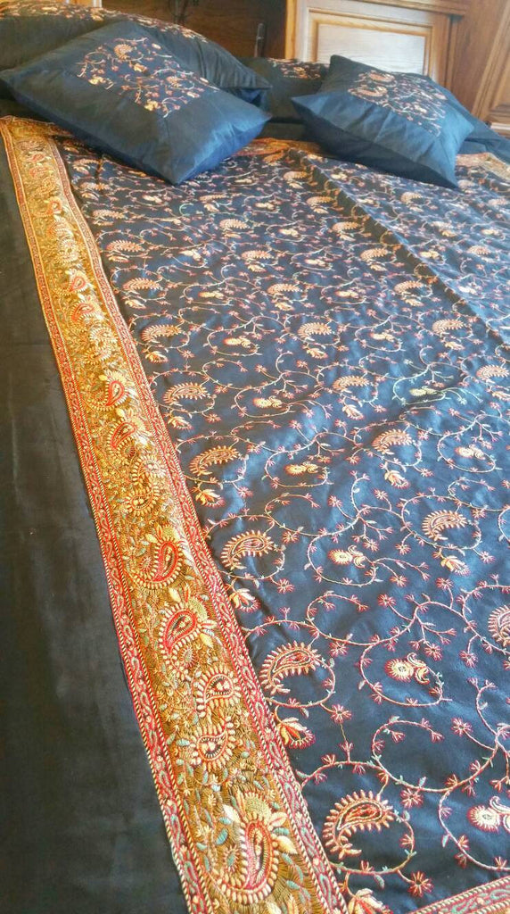 Just a mere glance is enough to appreciate the luxury feel of this bed spread. Wonderful Kashmiri silk embroidery on this Bed spread will blow you away with it’s sheer beauty. With traditional floral and mango seed motifs carefully stitched on the Black silk fabric, this bed spread set is going to bring that ‘Palatial feel’ to your bedroom. All the four sides are adorned with heavily Kashmiri embroidered mango seed motifs. Straight from the heart of India, Jaipur, passionately crafted, this exclusive set is sure to win your heart. All these sets are made to order in generous North American sizes.