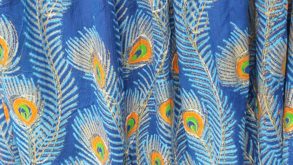 A splash of Purple, Orange and Blue colors on this beautiful Bohemian Peacock feather design looks vibrant. This is a tie-die master piece from Rangeelaa. The beautiful peacock feather designs are made with extra care. A minute silver thread work runs along the feather design and has small sequins etched on it. To the center of each feather are the florescent green and orange colors that make the design look bright. This is made of 100% rayon. Suitable for both casual and ethnic outfits. The waist band is elastic and can be adjusted with the help of string that is provided.