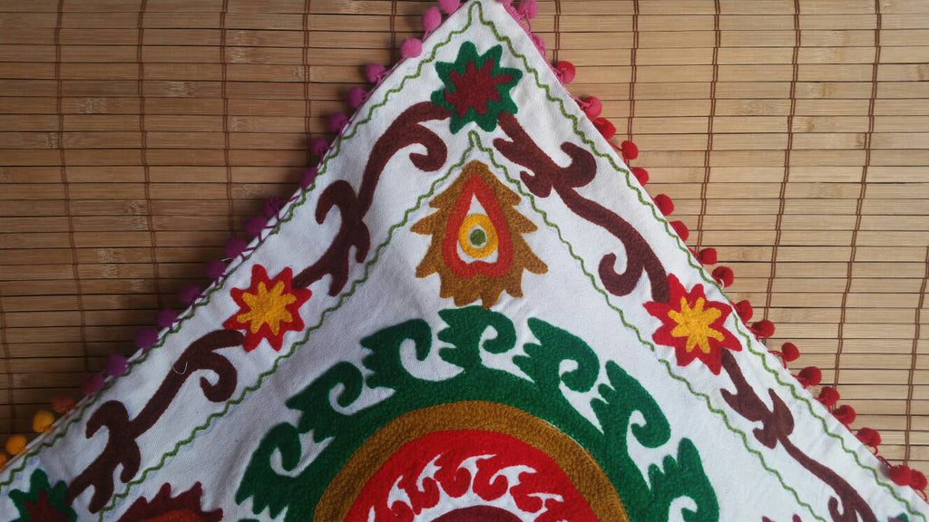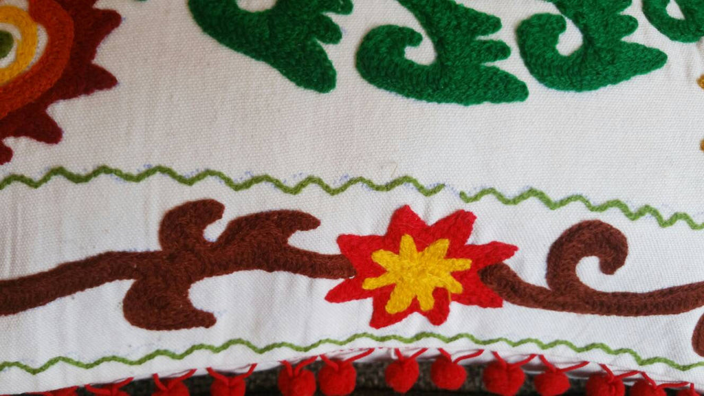 The cushion cover is made of Silk/Cotton/Wool embroidery on 100% thick Cotton fabric with cotton back cover. Due to Suzani covers being handmade, there might be some imperfections and pen marks as the unique patterns are drawn on the silk cover before being embroidered.