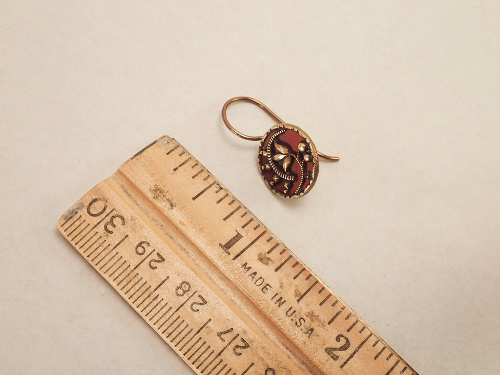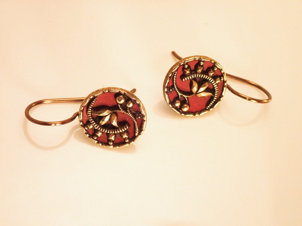 / Brass Button Earrings, Vintage Metal Buttons, Red & Gold Flower Design, Handmade Brass Ear Wires, Art Deco Earrings, Steel Cut Buttons