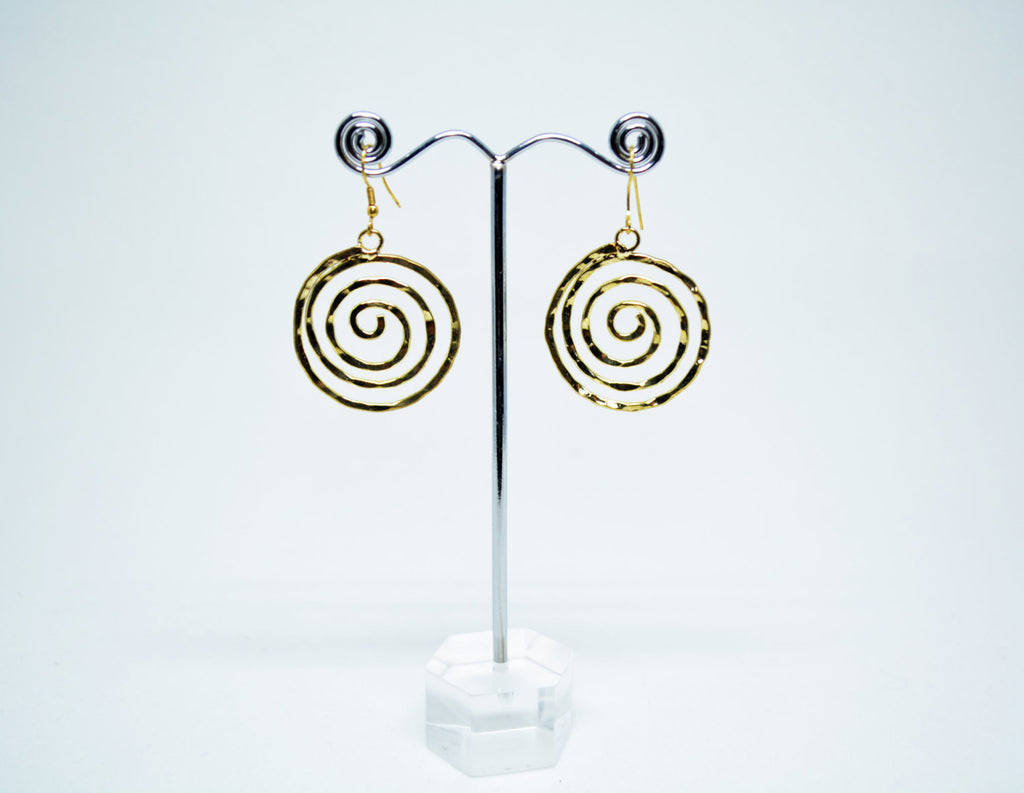 Beautiful handmade brass spiral dangle earrings. Hand forged and hammered to catch and reflect the light as you move.