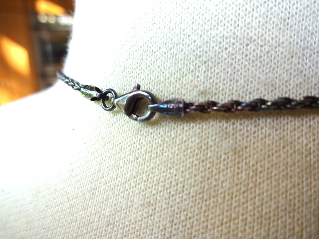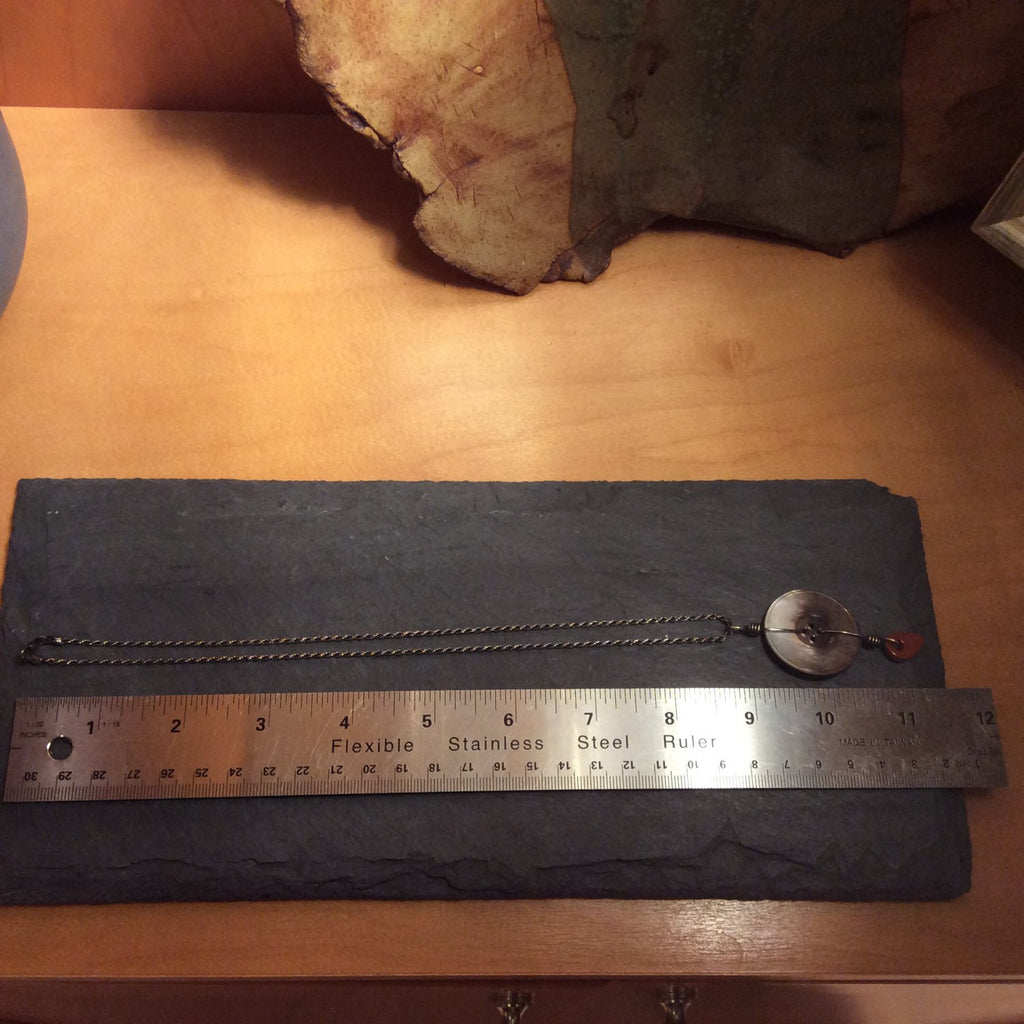 This is a lovely smooth rainbow smoky vintage mother of pearl button with a vintage but shiny terra cotta handmade teardrop charm up-cycled from an old necklace. The terra cotta color of the charm nicely reflects and accents the color of the button. The pendant is hung on a vintage oxidized sterling silver rope chain.