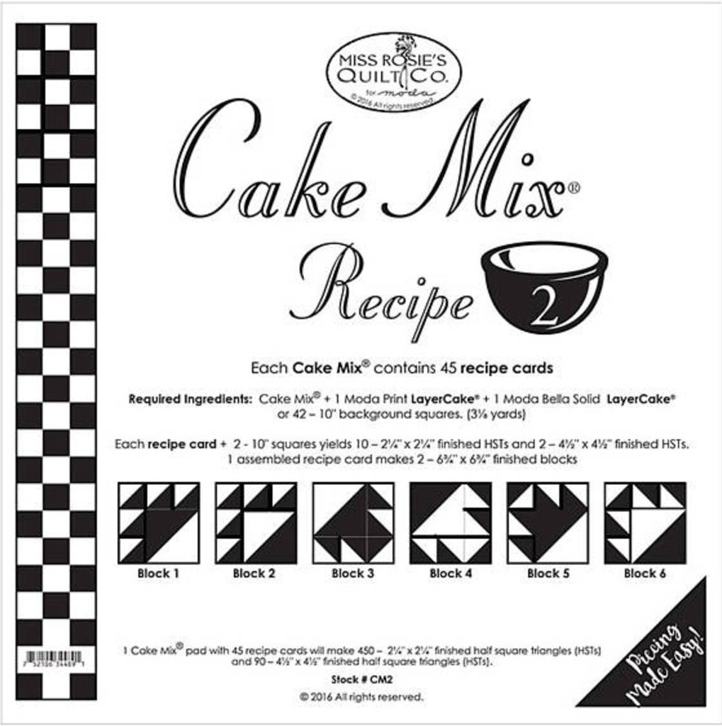 Cake Mix Recipe 2 by Miss Rosie's Quilt Co. for Moda Fabrics.Piecing Made Easy! Each Cake Mix Pad with 44 recipe cards will make 44 - 8" finished half square triangles and 176 - 4" finished half square triangles. Paper Piecing. Foundation Piecing.Make a variety of blocks with each Cake Mix Recipe Pad.Texas residents please be aware that a state sales tax of 8.25% will be added on to your purchase.Please feel free to message me with any questions.