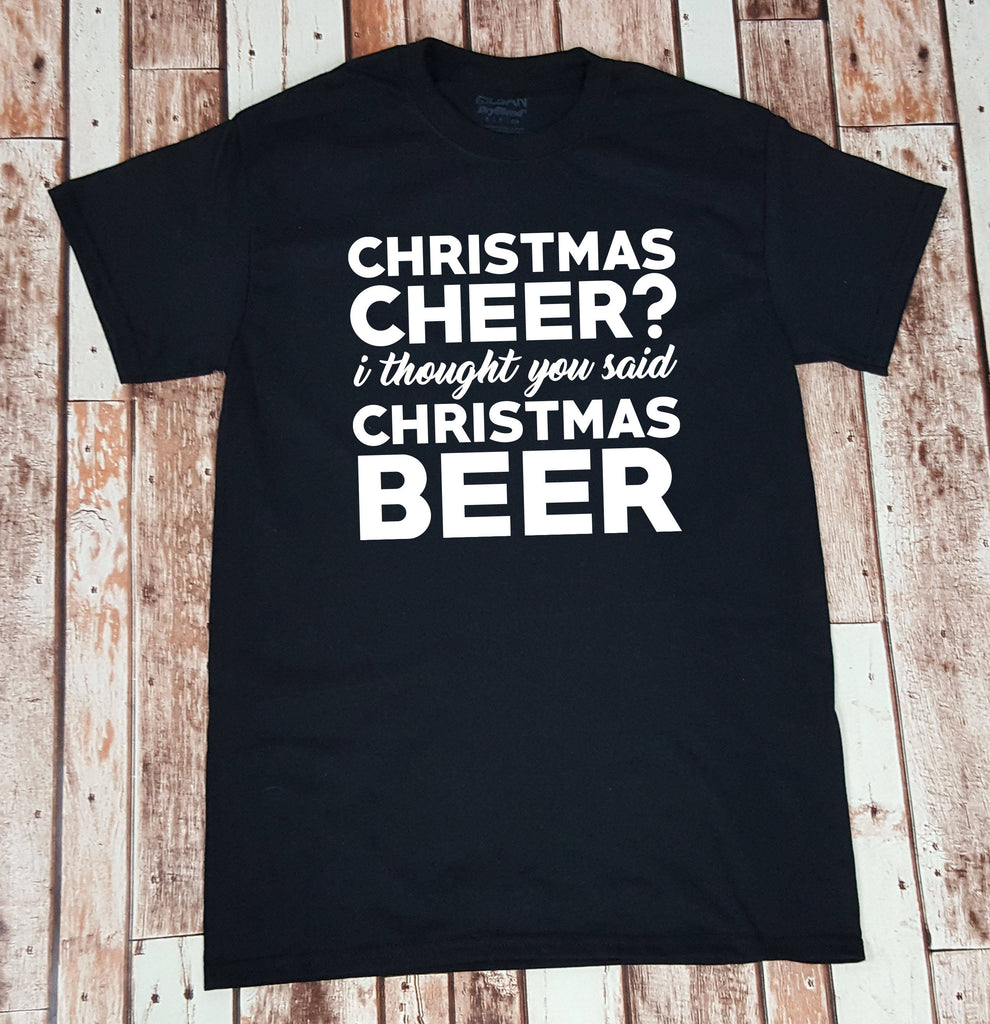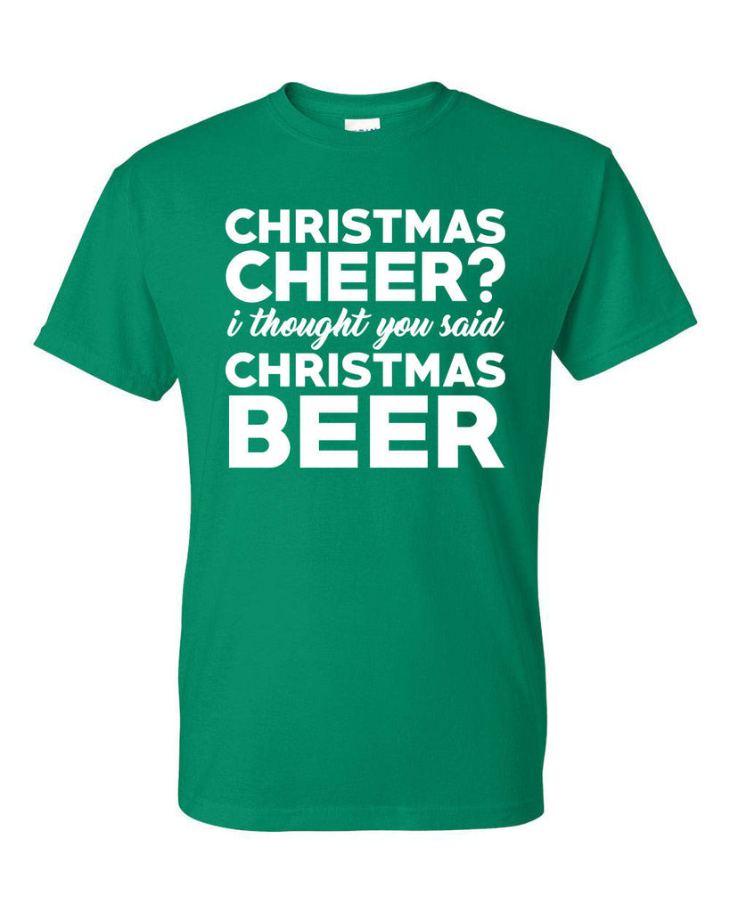 This listing is for (1) blend t-shirt, as seen in the pictures, that says: "CHRISTMAS CHEER? I THOUGHT YOU SAID CHRISTMAS BEER" This is for the Beer lover in your life!