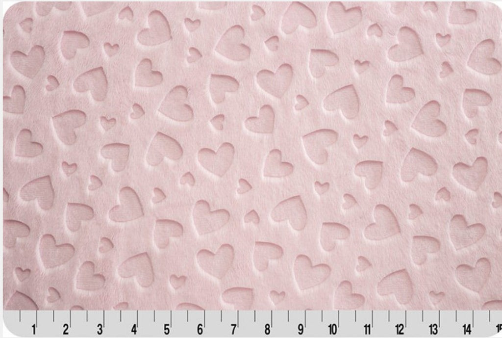 Embossed Heart Cuddle - Blush 58"/60" Minky Yardage by Shannon Fabrics 100% Polyester58/60" WideThis Exclusive Cuddle Minky fabric has a textured, velvety surface. Features a playful heart embossed design. Suitable for apparel, quilting, baby products, home d̩cor, pet accessories, and more.Machine wash cold, tumble dry low. Do not iron.Choose your length and quantity from the drop down menu in the upper right corner of this listing.Fabrics will be cut continuously if more than half yard is ordered.If you need a different amount please message me and I will put up a custom listing for you. Shipping is automatically combined when you add multiple items to your cart. If shipping is overcharged we will issue refunds. All fabrics come from a smoke-free, pet-free environmentTexas residents please be aware that a state sales tax of 8.25% will be added on to your purchase.Please feel free to message me with any questions.