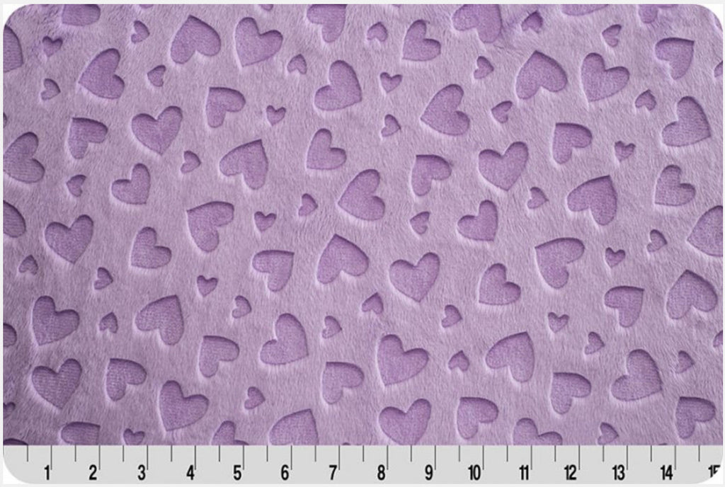 Embossed Heart Cuddle - Lilac - 58"/60" Minky Yardage by Shannon Fabrics100% Polyester 58/60" WideThis Exclusive Cuddle Minky fabric has a textured, velvety surface. Features a playful heart embossed design. Suitable for apparel, quilting, baby products, home d̩cor, pet accessories, and more.Machine wash cold, tumble dry low. Do not iron.Choose your length and quantity from the drop down menu in the upper right corner of this listing.Fabrics will be cut continuously if more than half yard is ordered.If you need a different amount please message me and I will put up a custom listing for you. Shipping is automatically combined when you add multiple items to your cart. If shipping is overcharged we will issue refunds. All fabrics come from a smoke-free, pet-free environmentTexas residents please be aware that a state sales tax of 8.25% will be added on to your purchase.