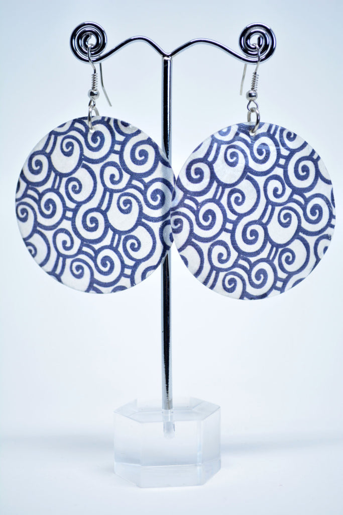 These original dangle earrings are made from a very thin layer of white sea shell painted with spiral motif.