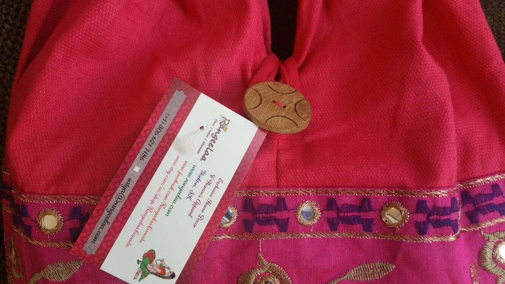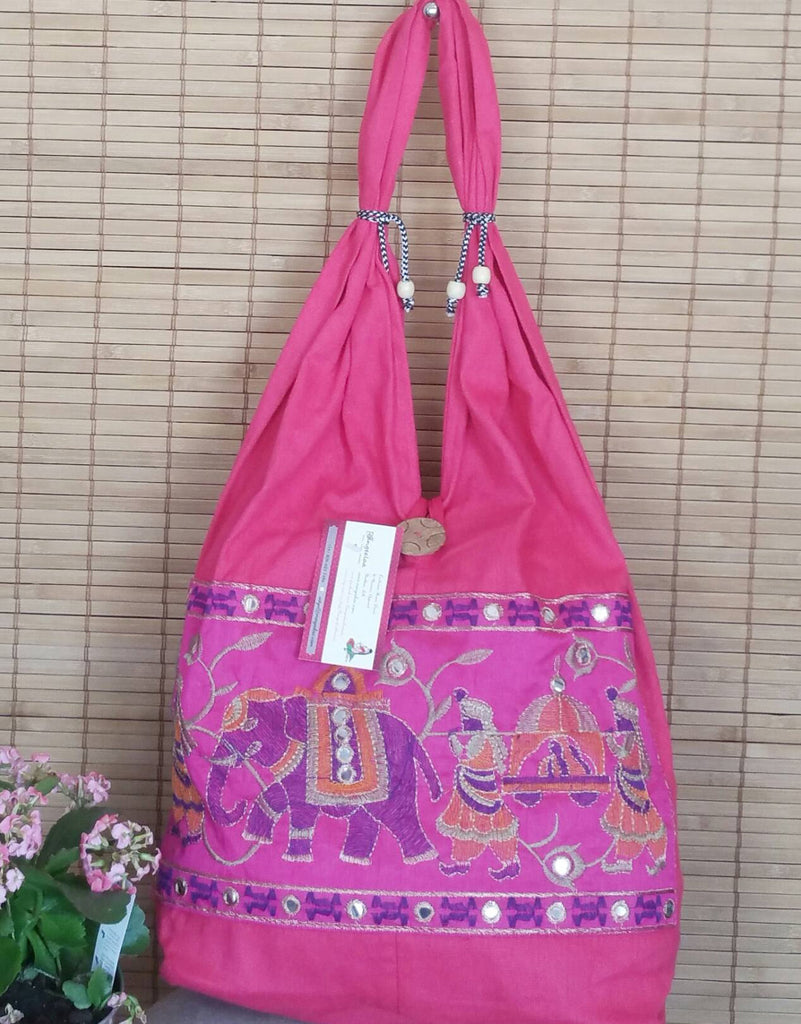 This gorgeous shoulder bag is beautifully embroidered with colorful Elephant and Palanquin design and embellished with tiny mirrors and metallic thread. This bag features a carved wooden button to close and wooden bead tie detail on the straps. Includes an internal zip pocket. Handmade in India for Rangeelaa.