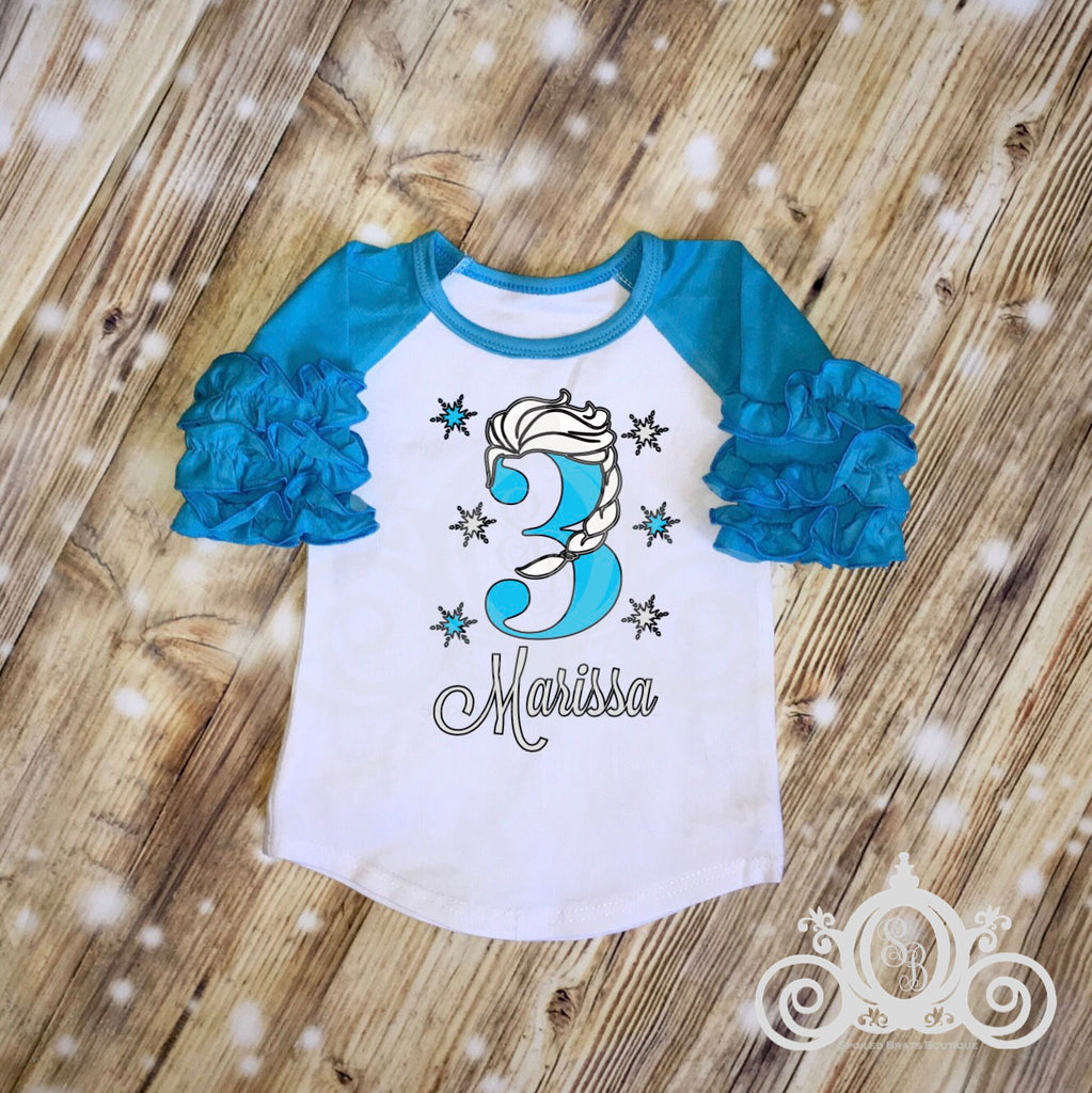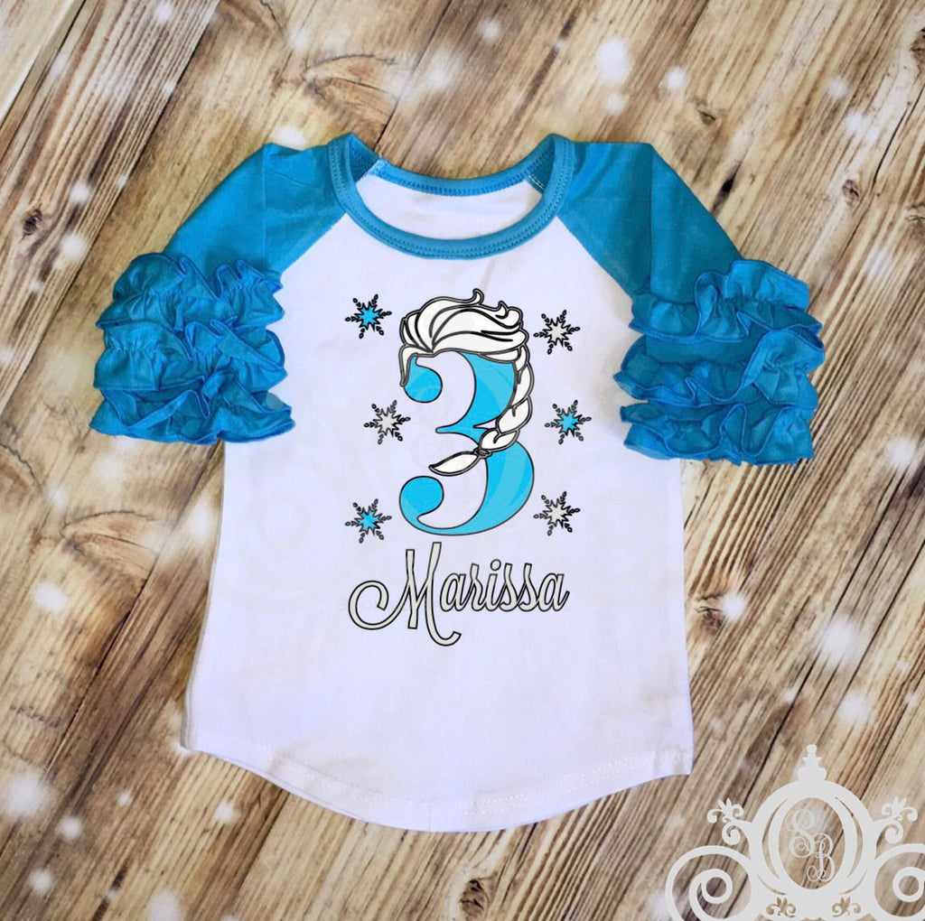 Elsa Braid Frozen Birthday Shirt | Ruffle Raglan Personalized w Name & Age nnThis listing is for the specific design shown. If you are looking for custom designs, please choose the blank "Custom Design" shirt in the color of your choice. Please add a photo or comment in the box at checkout to let us know what design you would like on your shirt. nnWe have a great selection of tops for your little princess. We are very well known for ruffle raglans in a rainbow of colors. But during these super hot months, we need something a little cooler but still really cute and girly. We design all of our tops to give you that sweet, girly look you love. Our bubble sleeve tees are super cute and stylish for any little girl. Short sleeves with a little bit of a rouched cap/bubble sleeve. And we now have our collection of tanks (with a tiny ruffle around the neck) available, as well. And, if all the ruffles and frills aren't her thing, we have basic tees and raglans, as well! nnPlease choose whether you want shirt or set & choose a size. Personalization with name & number is included in this listing. You could also choose to add an initial instead of a number or choose to remove altogether, if you wish. nn🛠CHECKOUT NOTE: If you are ordering a set and your child is in diff size top and bottom, please list them in the box at checkout.nn🎀 Please note their NAME and AGE for customization. During warmer mos, shorts will be sent and pants during cooler months. If you have a preference, please let us know. nn🎉 Please include your party date so that we may ensure you get your item in the time necessary. nn👚 Tees, tanks and pants all true true to size, raglans run slightly large. Please order on size or go down one.nnFor more designs for your upcoming holidays, birthdays, school functions, baby showers, etc, check out the rest of my store @