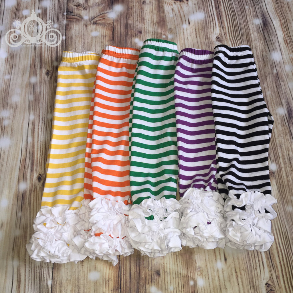 Fall Halloween Yellow/White Striped Icing Ruffle Leggingsnn95% Cotton/5% Spandex (True to Size )nnSizes 12mos - 8yrsnnAll leggings have solid color white ruffles!