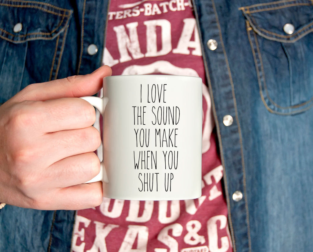 Does this "I love the sound you make when you shut up" mug, describe you in the mornings before you have had your coffee? Features a trendy black font on a white ceramic mug and comes in a gift box, perfect for gift-giving.