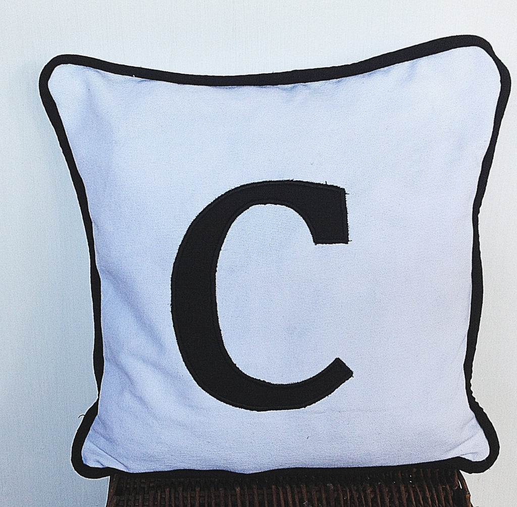 Snazzy living personalized 12" x12" name pillows are custom made with your baby's initial appliquǸd on to gorgeous 100% cotton fabric and finished with a black piping all around the pillow.