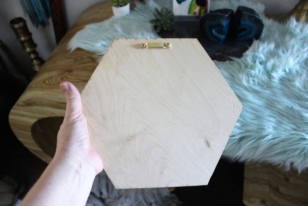 --baltic birch wood hexagon backing, painted half white matte with custom stain on other half