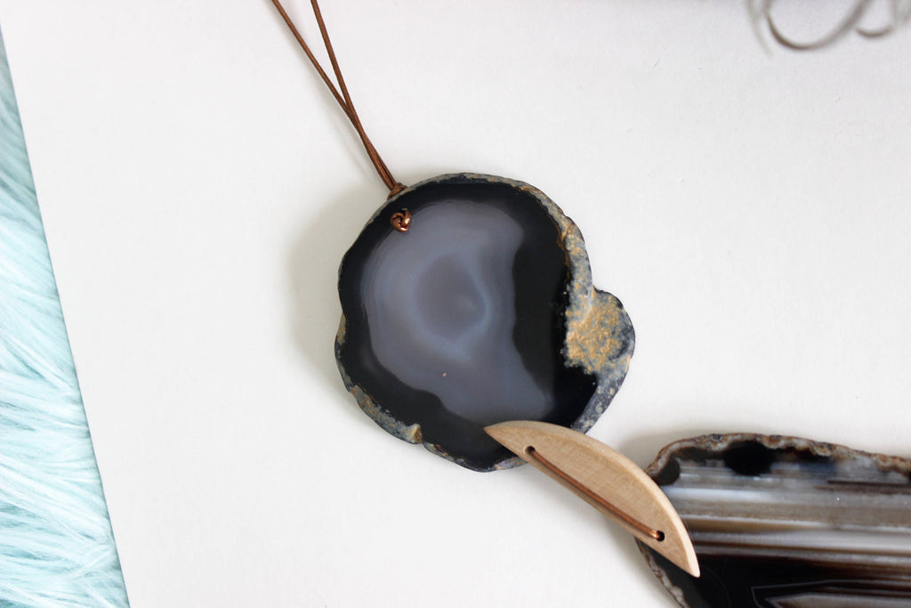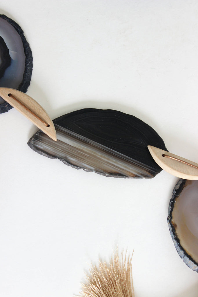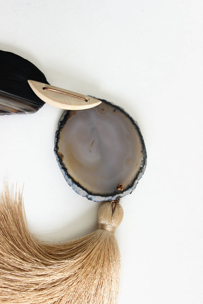 Materials: agate,wood,bronze leather,leather,silk tassel,geode,agate geode,grey,grey agate,grey agate slice,gray agate geode,black agate,FREE SHIPPING