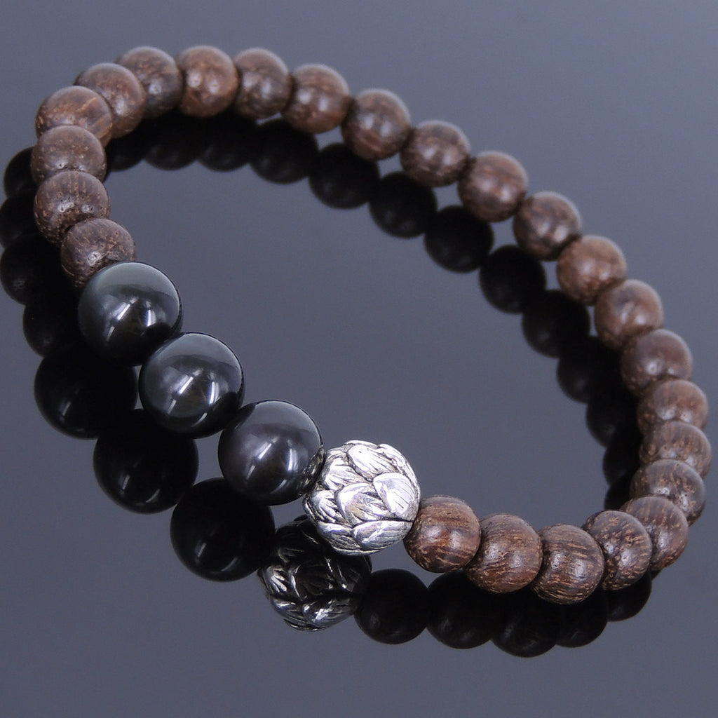 Handmade Agarwood Bracelet Black Obsidian Tibetan Silver Lotus Prayer Meditation Mala MEN WOMEN DiyNotion A037