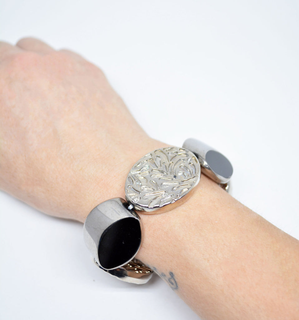 Handmade Expandable Glass Beads Bracelet Black Beads Oval Carved Resin Beads Bracelet Boho Bracelet Silver Color Finishing Gift For Her