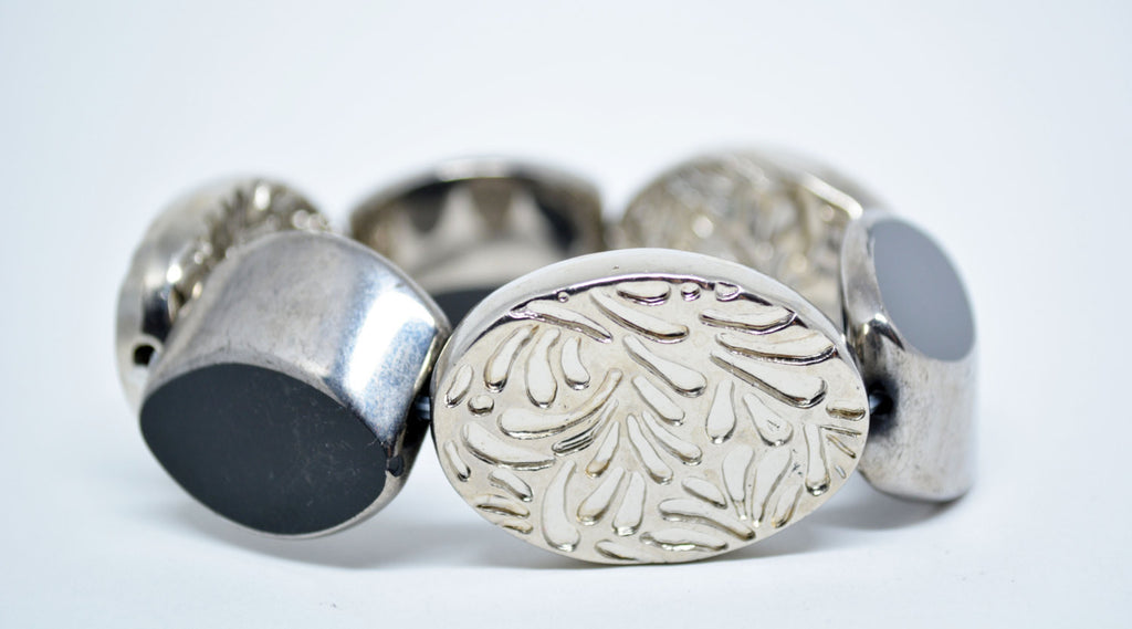 This lovely glass bracelet is an expandable wrist bracelet decorated with faceted black glass beads and resin silver color oval beads. It's full of sparkle and is bound to be admired when worn!!...