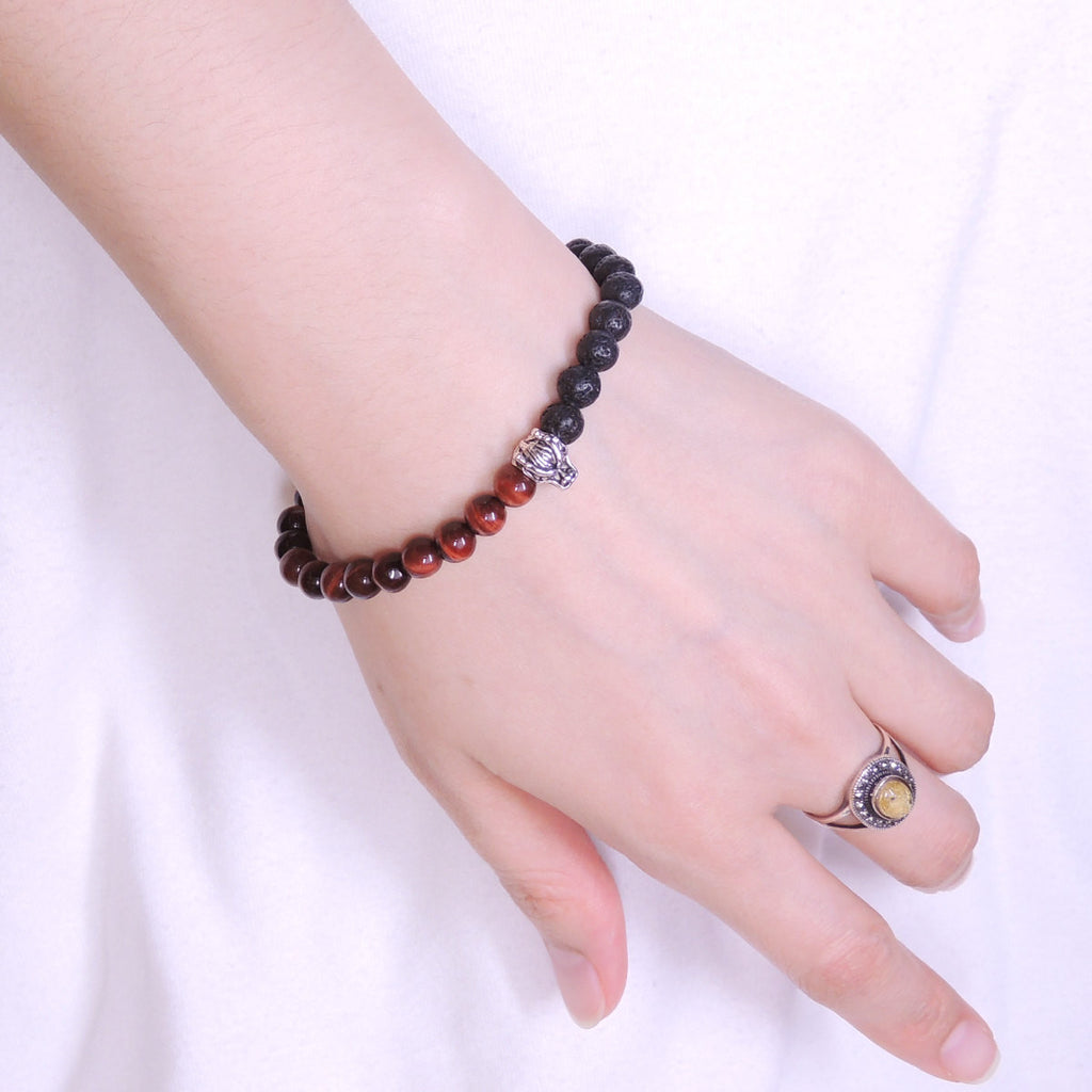 Handmade Men Women Gemstone Bracelet Red Tiger Eye Lava Rock 925 Sterling Silver Wolf DiyNotion BR408