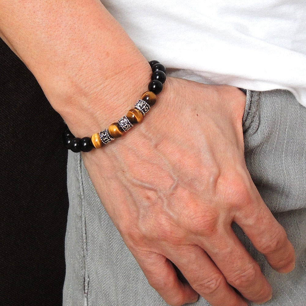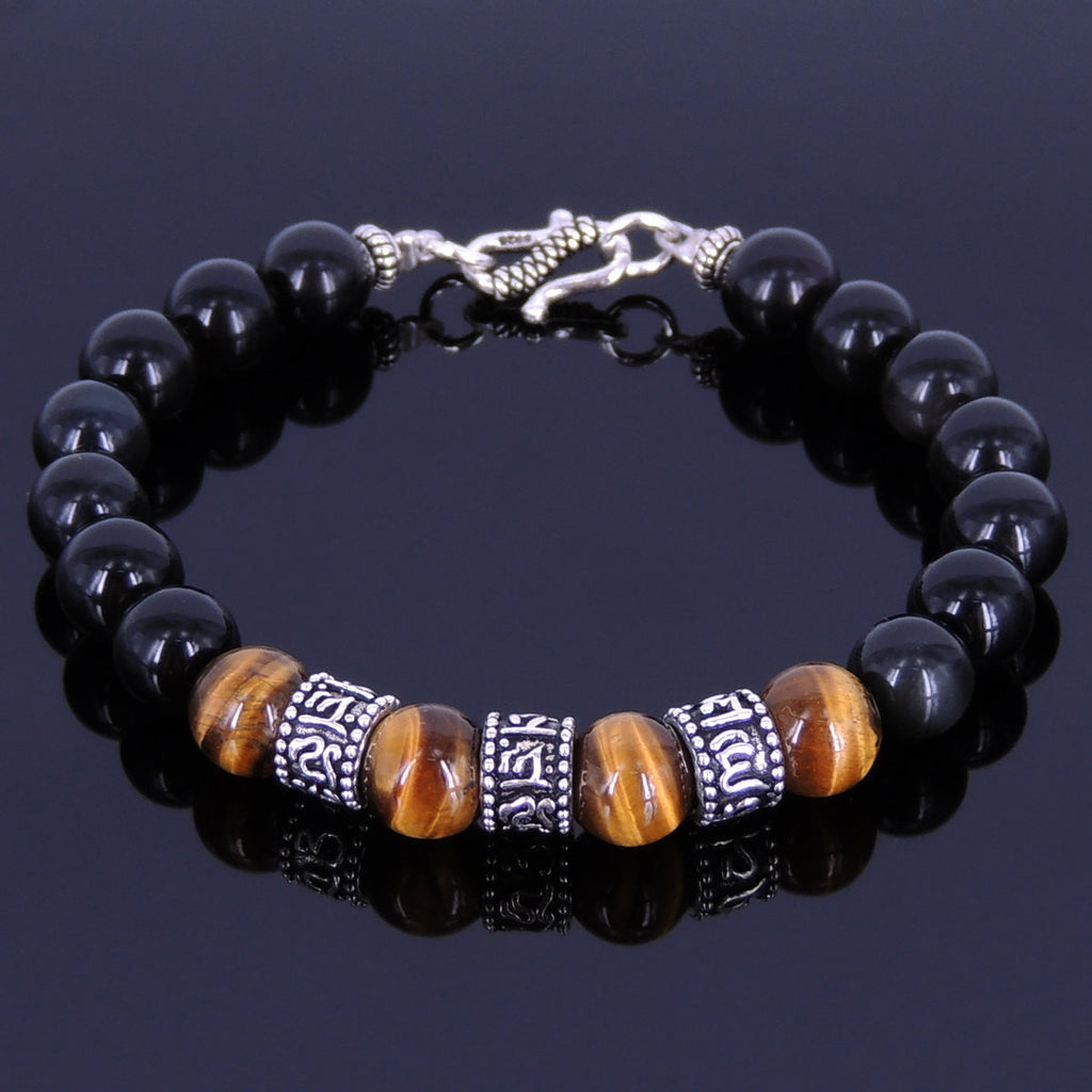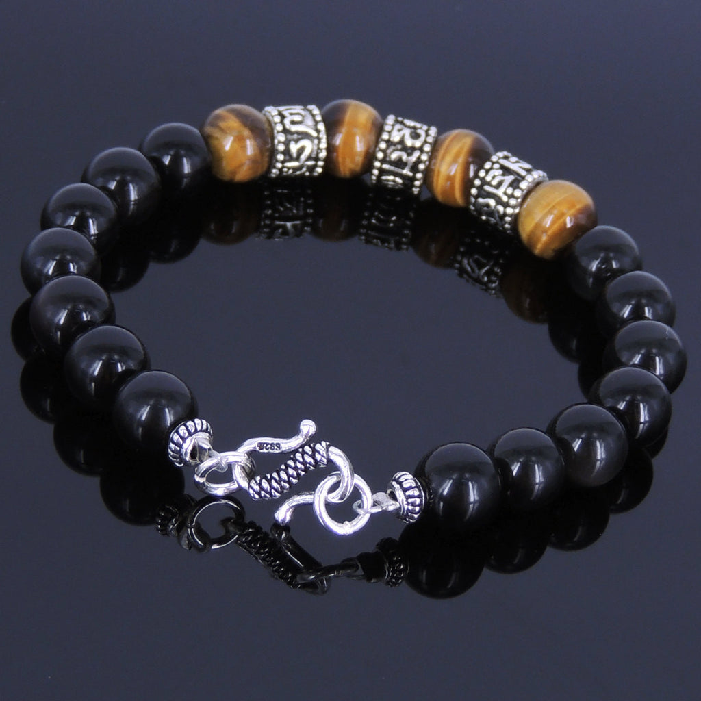 Handmade Men Women Healing Gemstone Bracelet Black Obsidian Tiger Eye S925 Sterling Silver Spacers & Clasp DiyNotion BR123