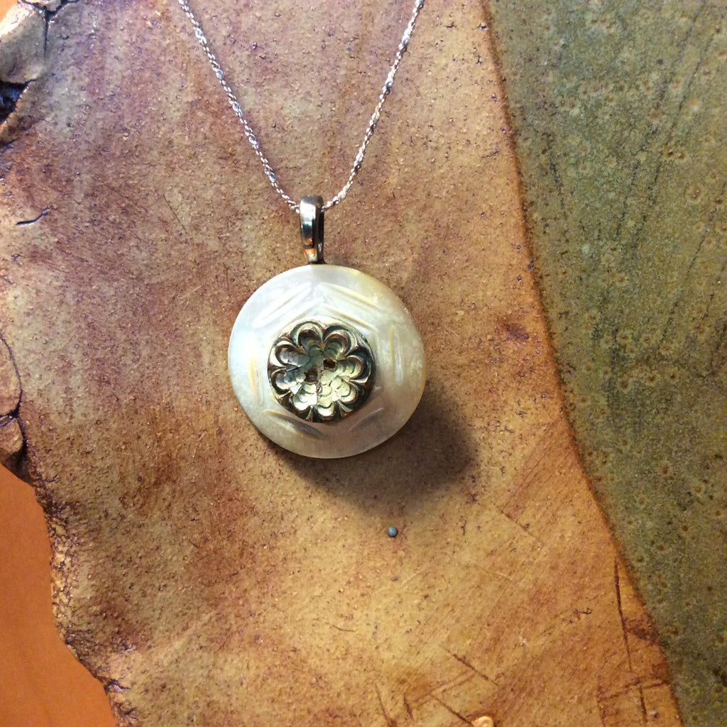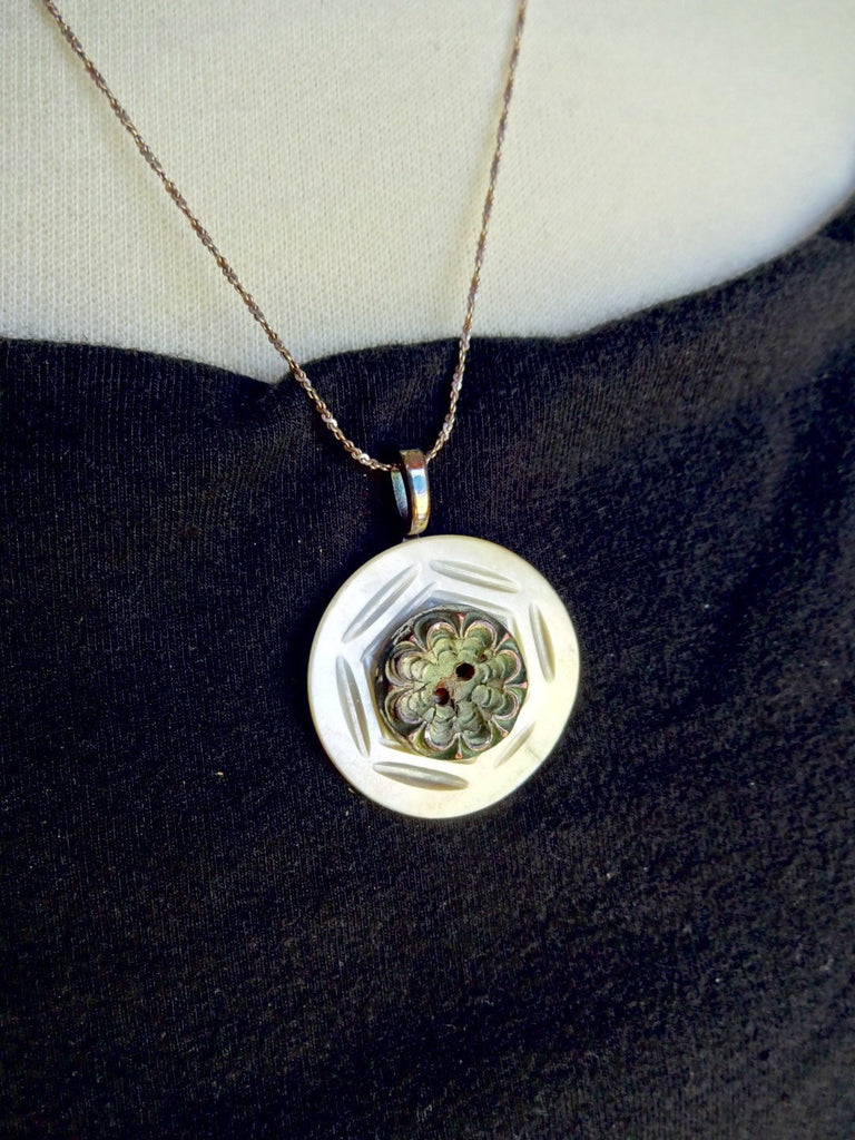This is a layered button pendant created with a lovely handmade vintage carved mother of pearl button. It is accented with an old metal button with a verdigris finish and an intricate and delicate scallop or floral pattern. The pendant is hung on a vintage 20" sterling silver chain.