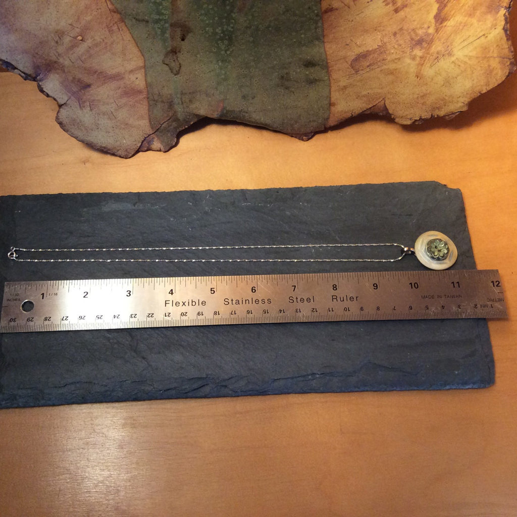 Handmade Vintage Mother of Pearl Button Layered Pendant Necklace, Metal Verdigris Flower Button, 20" Sterling Silver Twist Chain, MPN203
