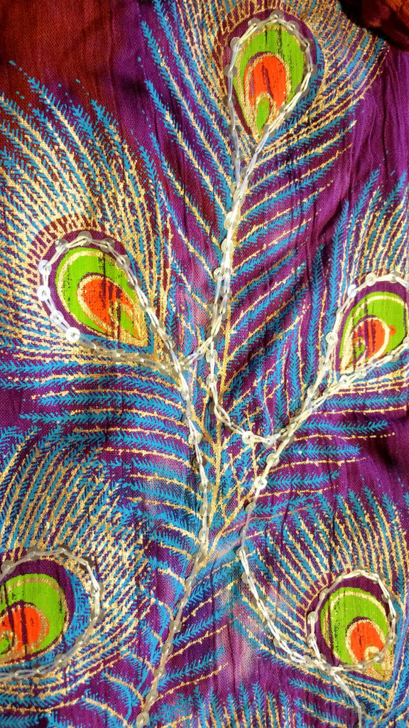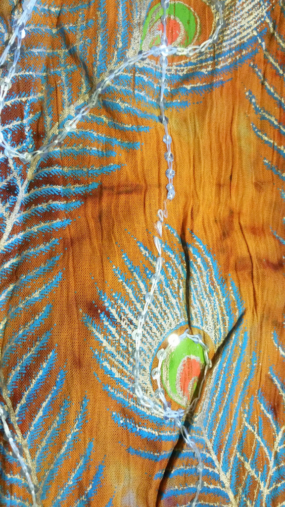 A splash of Purple, Orange and Blue colors on this beautiful Bohemian Peacock feather design looks vibrant. This is a tie-die master piece from Rangeelaa. The beautiful peacock feather designs are made with extra care. A minute silver thread work runs along the feather design and has small sequins etched on it. To the center of each feather are the florescent green and orange colors that make the design look bright. This is made of 100% rayon. Suitable for both casual and ethnic outfits. The waist band is elastic and can be adjusted with the help of string that is provided.