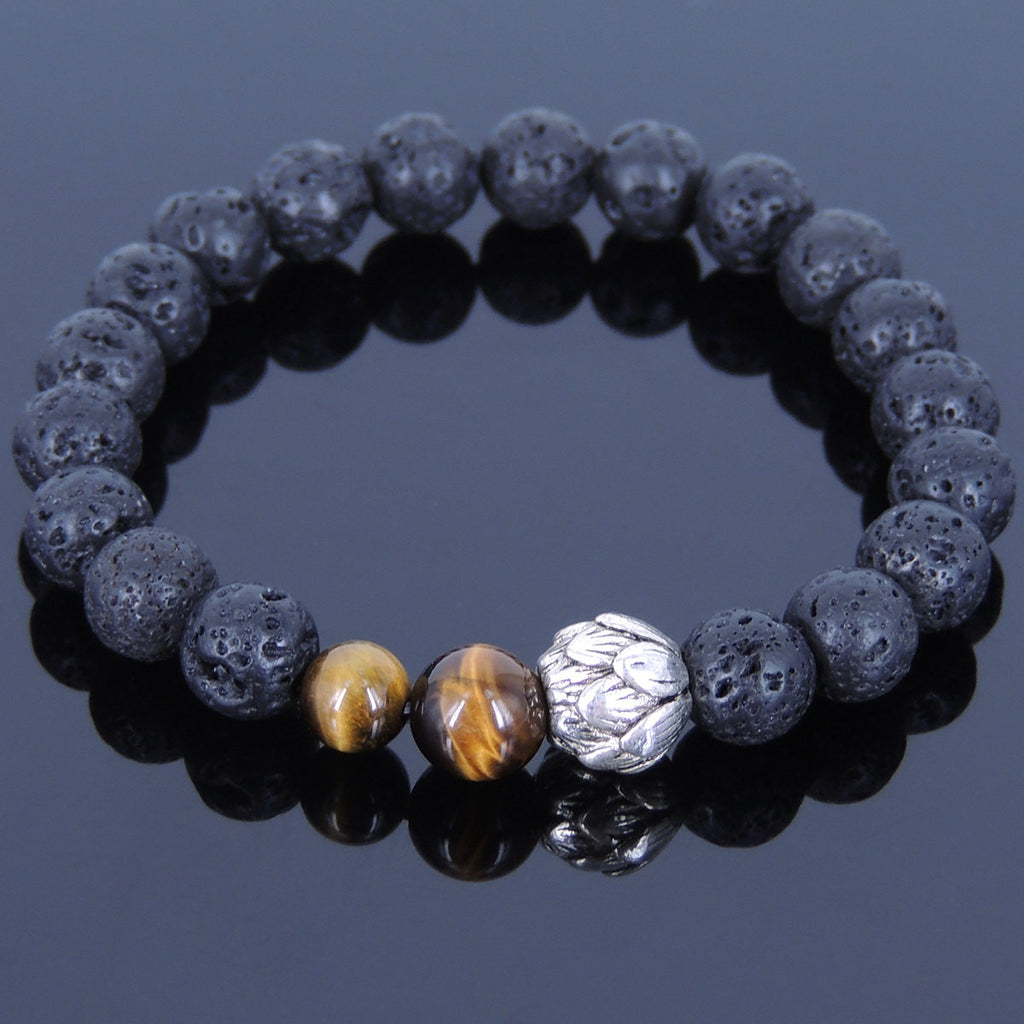 Lava Rock Tiger Eye Tibetan Silver Bracelet Lotus Yoga Mala for Men Women DiyNotion Handmade T054