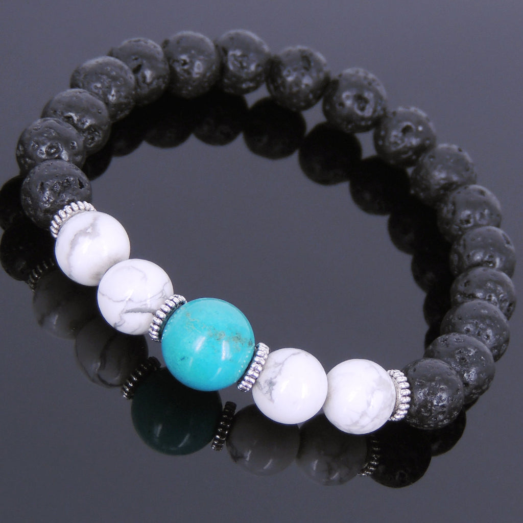 Materials: 8mm Lava Rock,8mm White Howlite,10mm Turquoise,Tibetan Silver,Elastic Cords